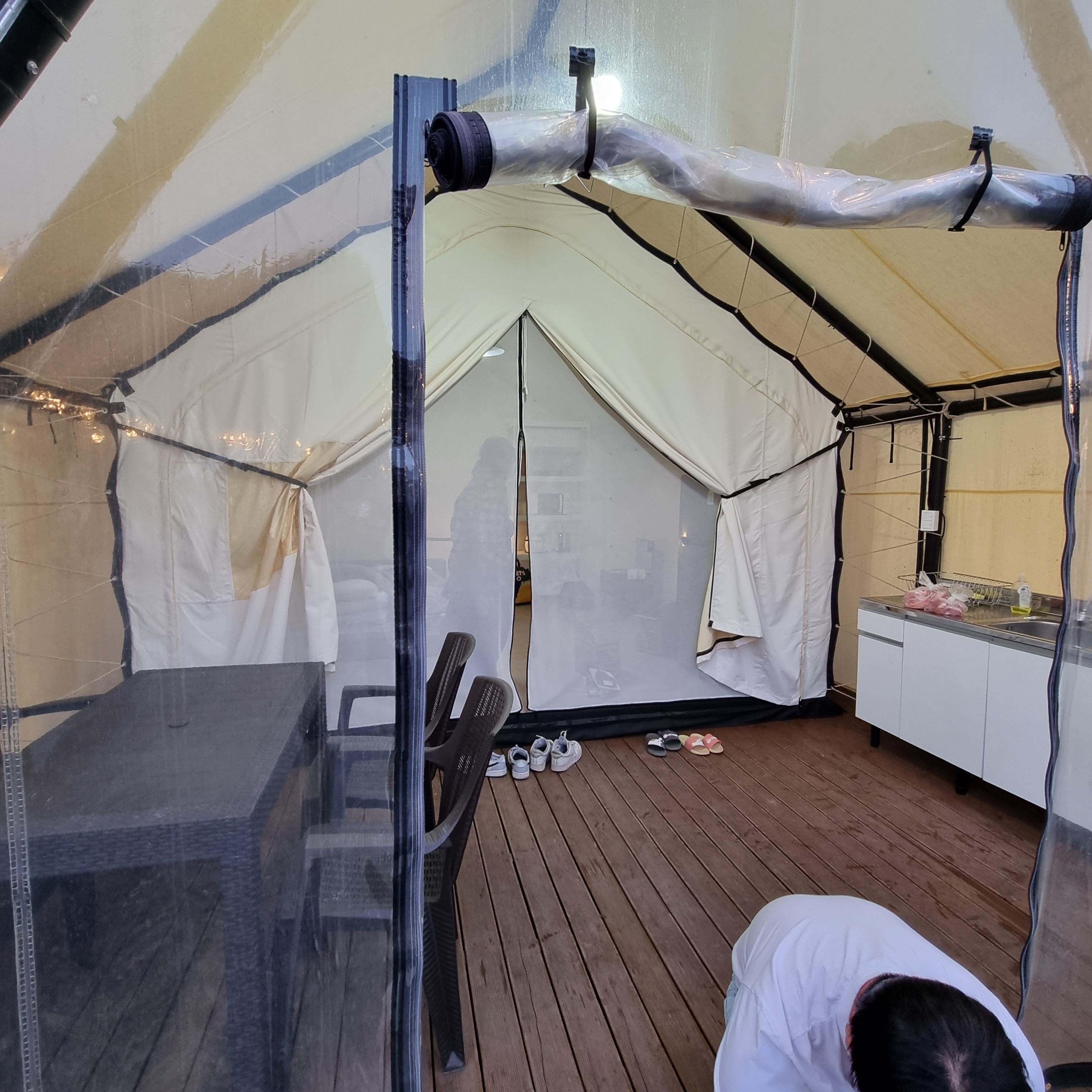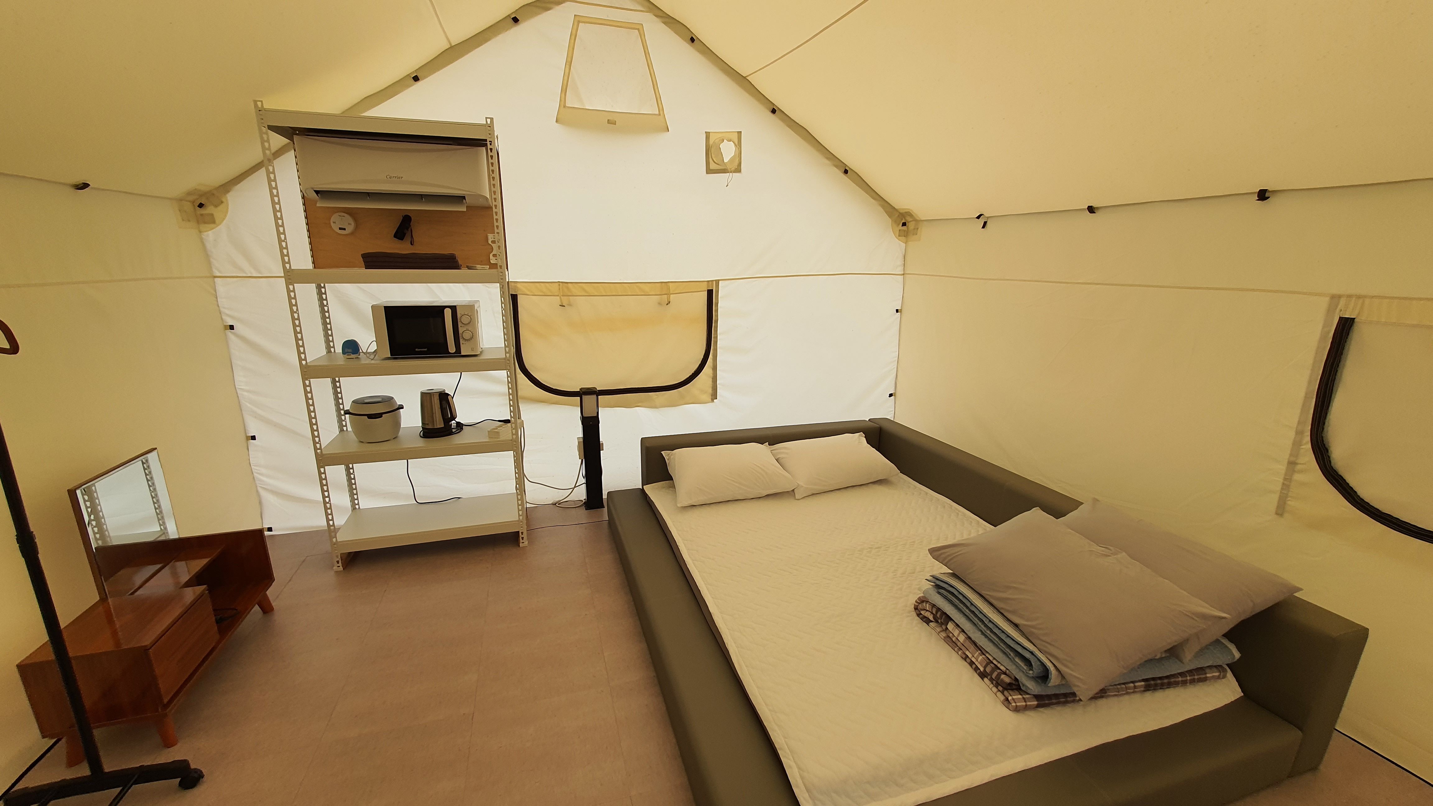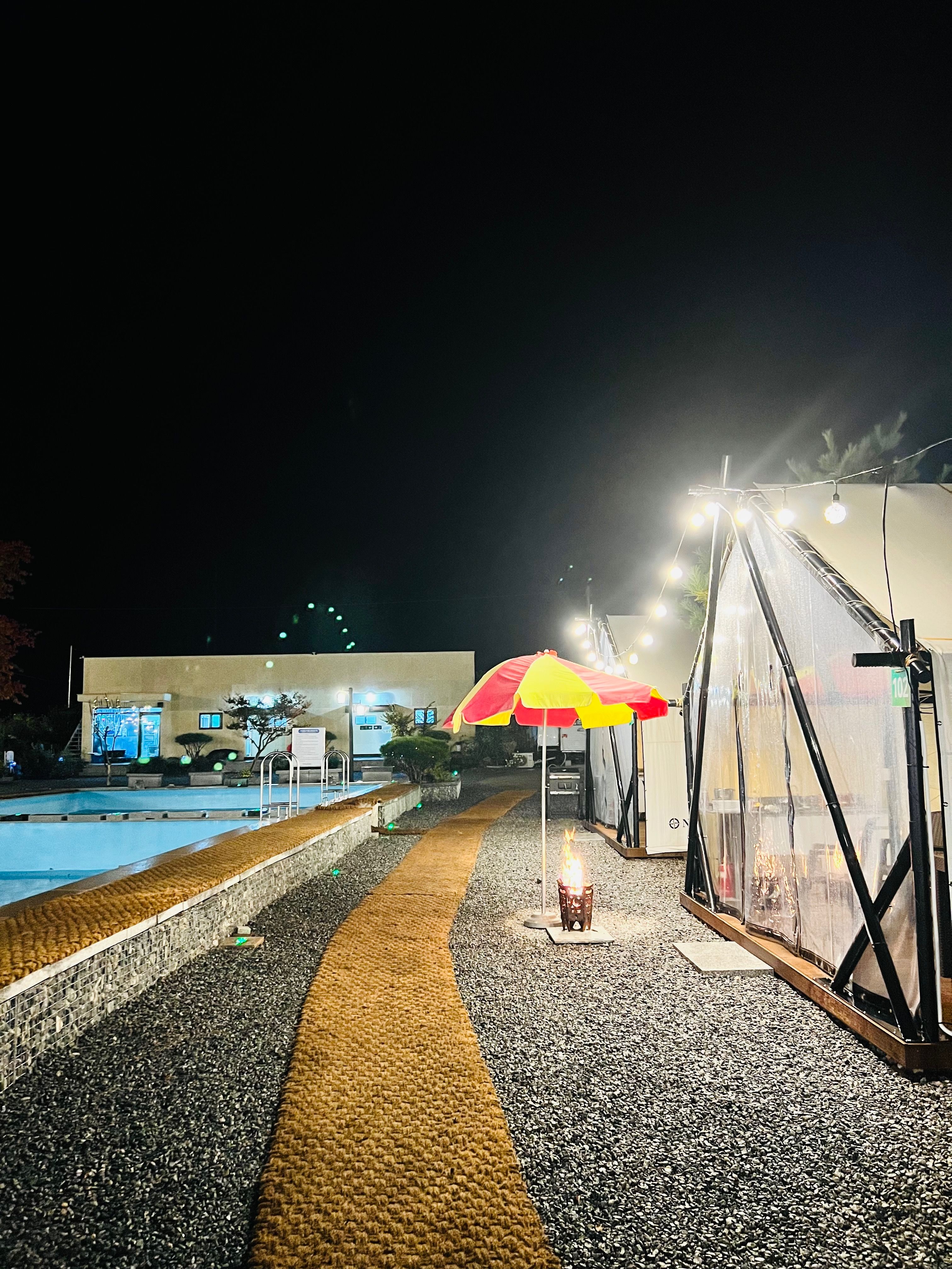 해 질 녘 알전구가 켜지며 야경이 멋졌습니다. 또한 침구류나 화장실도 무척 깔끔했습니다. 다만 텐트 내 곰팡이가 너무 심하여 이점은 꼭 개선되었으면 합니다.