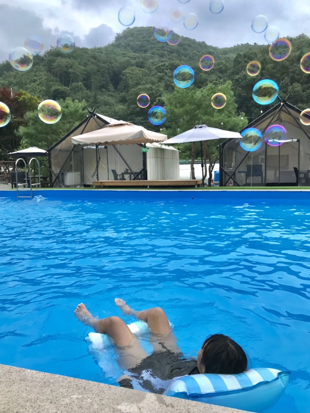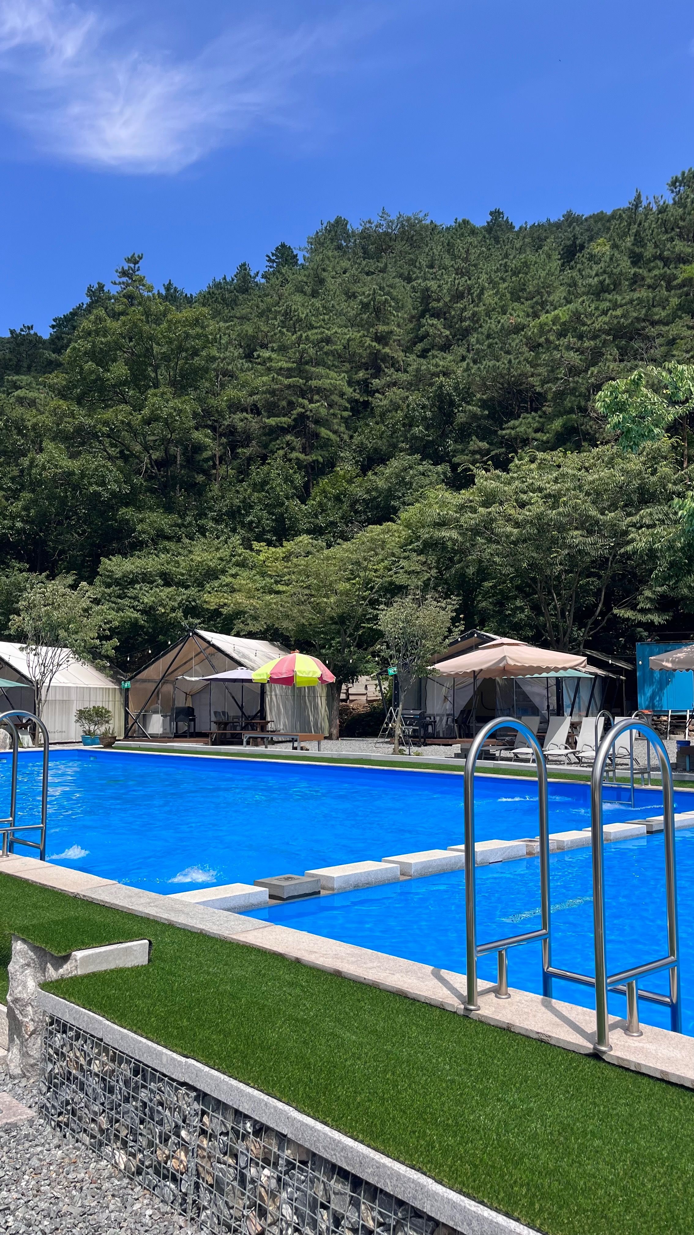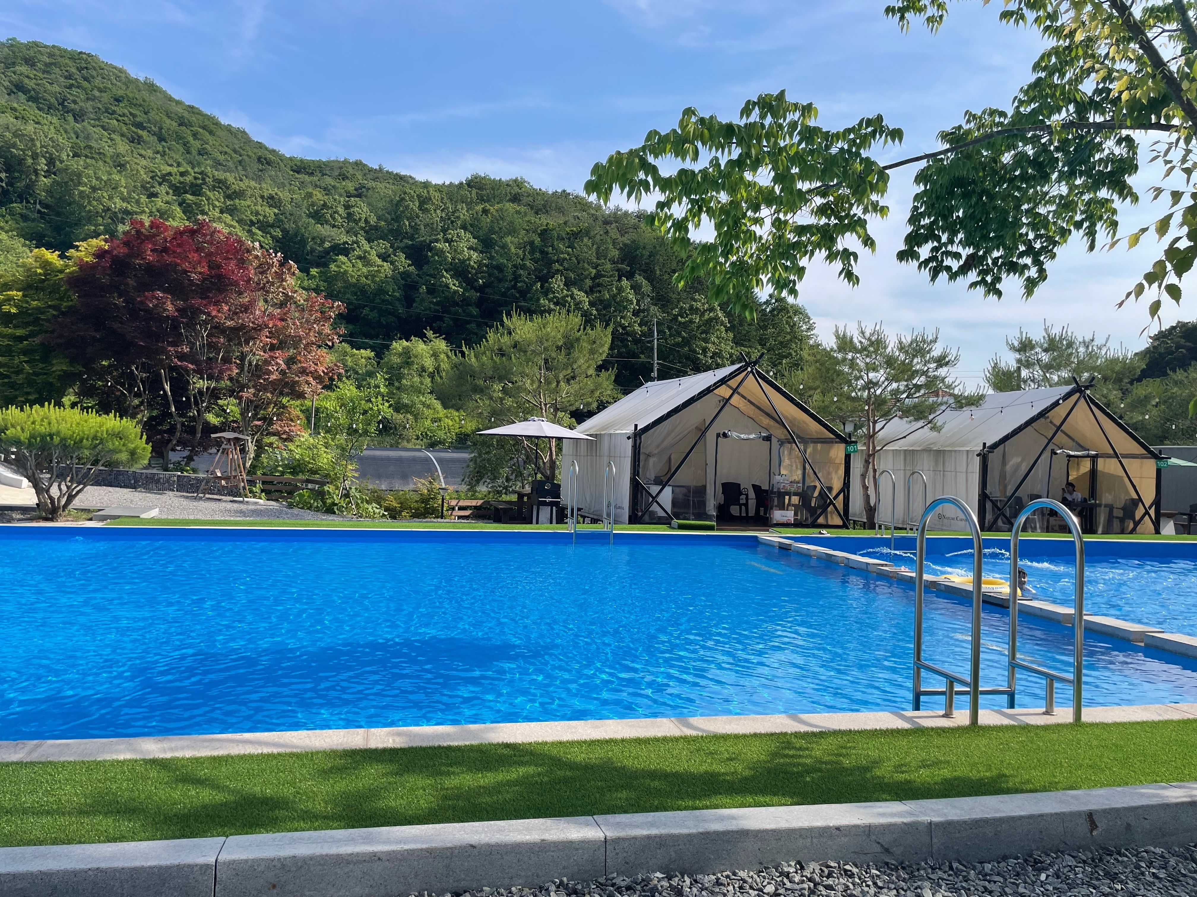 가격도 저렴한데 수영장도 넓고 깨끗했고 샤워실이랑 화장실도 쾌적했어요ㅎㅎ 무엇보다 글램핑장 주변에 시냇물도 흐르고 산이 있어서 뷰가 너무 예뻤어요!! 해먹이랑 선베드 같은 시설도 있어서 쳔하게 잘 쉬다왔네요. 다들 불멍도 꼭하세요! 사장님이 주신 가루 뿌려서 예쁜 불도 구경하면서 좋은 여름 휴가 마무리 지었어요~!