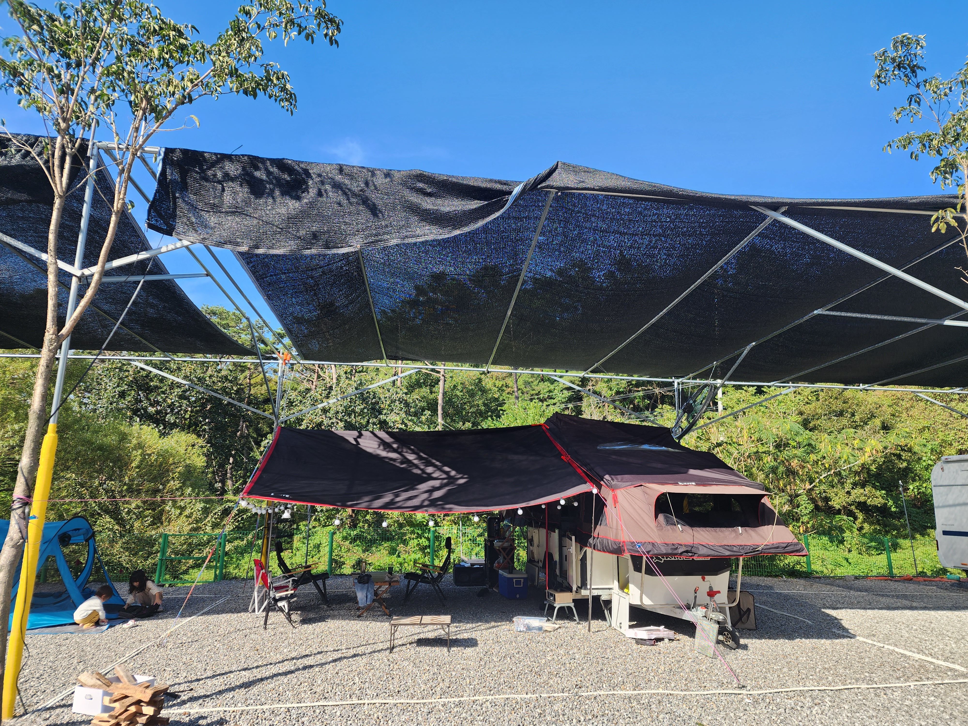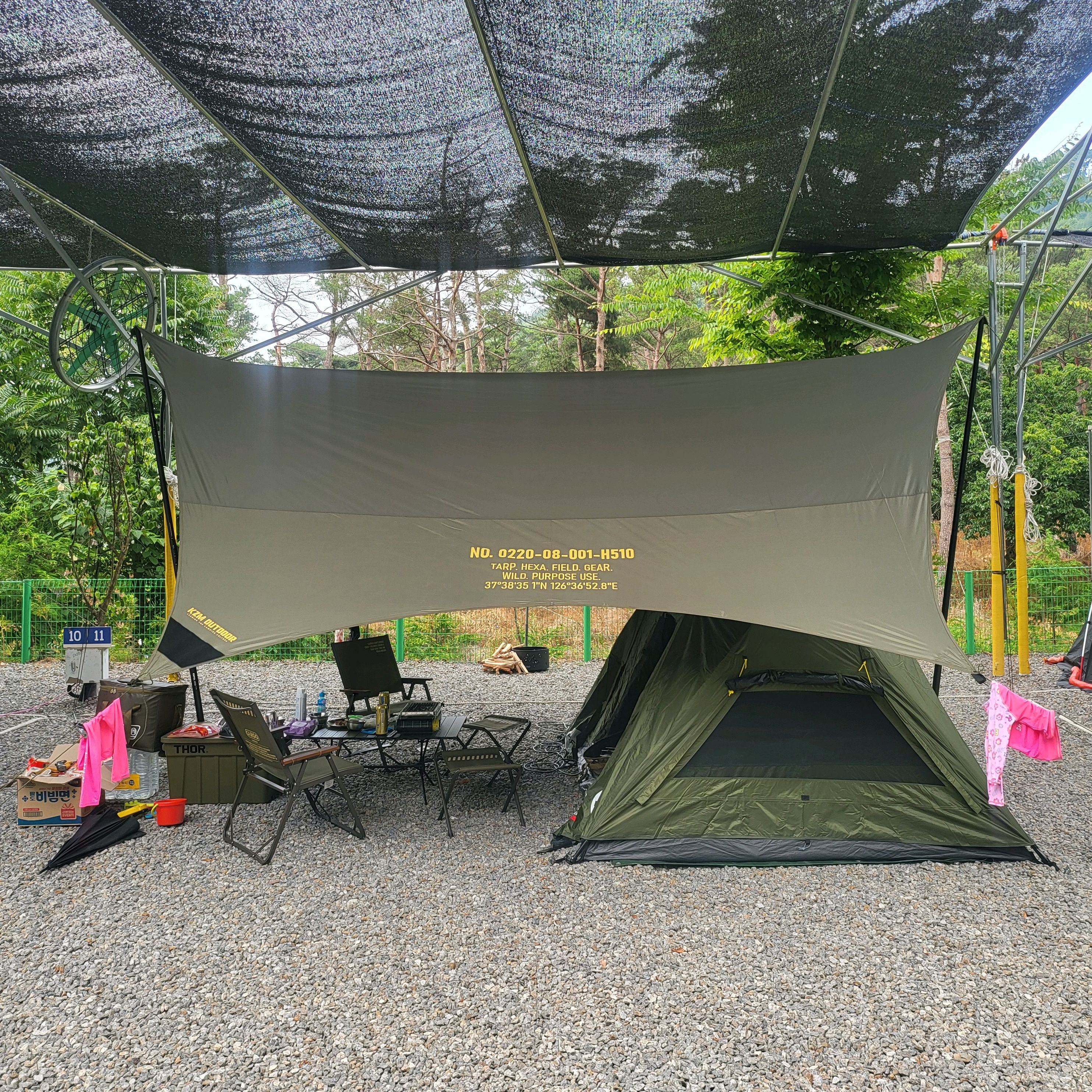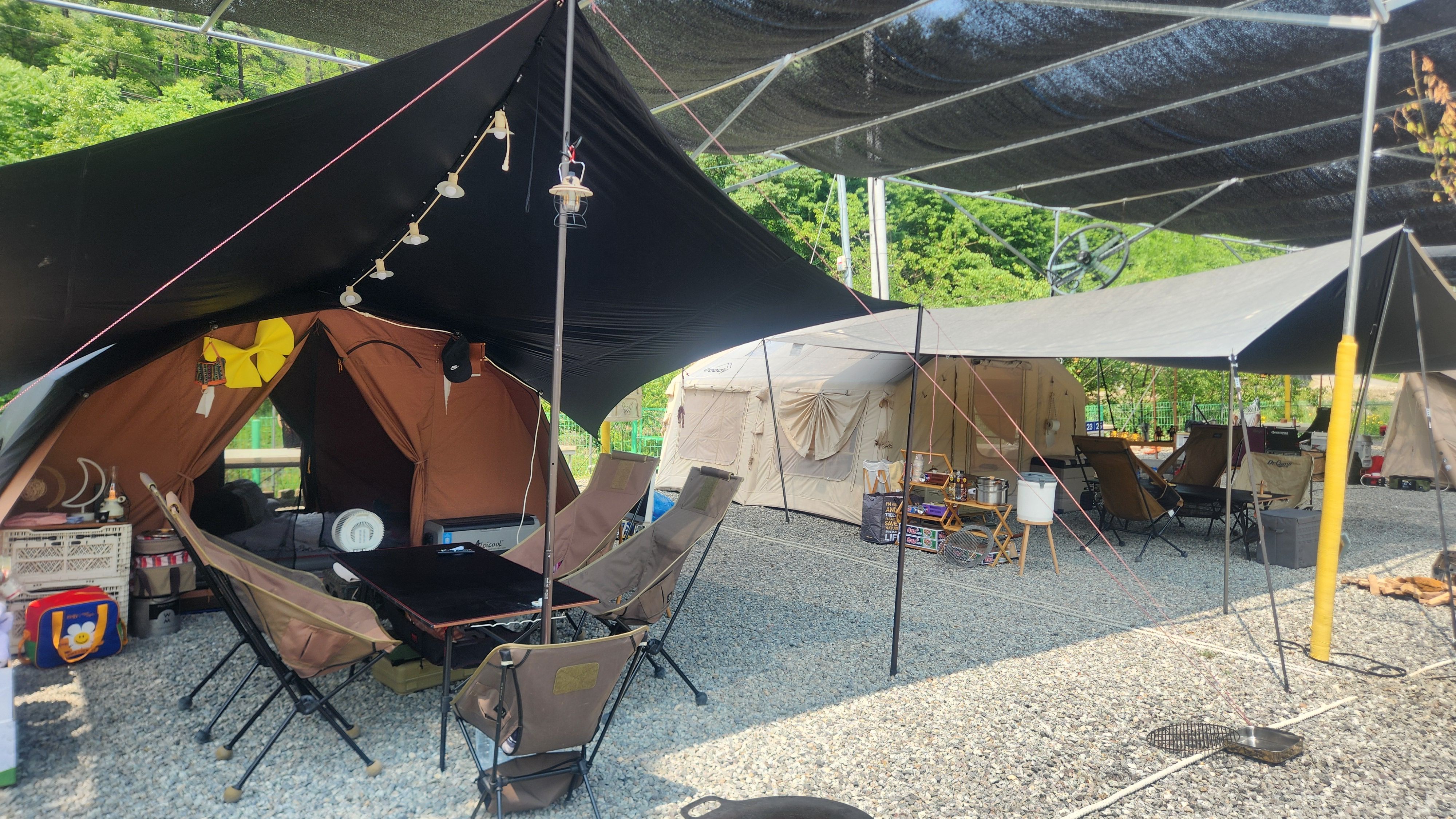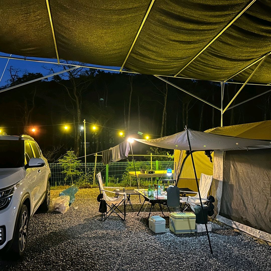 일자로 쭈욱있어서 프라이버시가 없겠다 싶었는데 워낙 사이트가 넓어서 차도 옆에 둘수있고, 위에 차양막있어서 타프없는 저희에게는 더할나위 없이 좋았어요👍👍👍