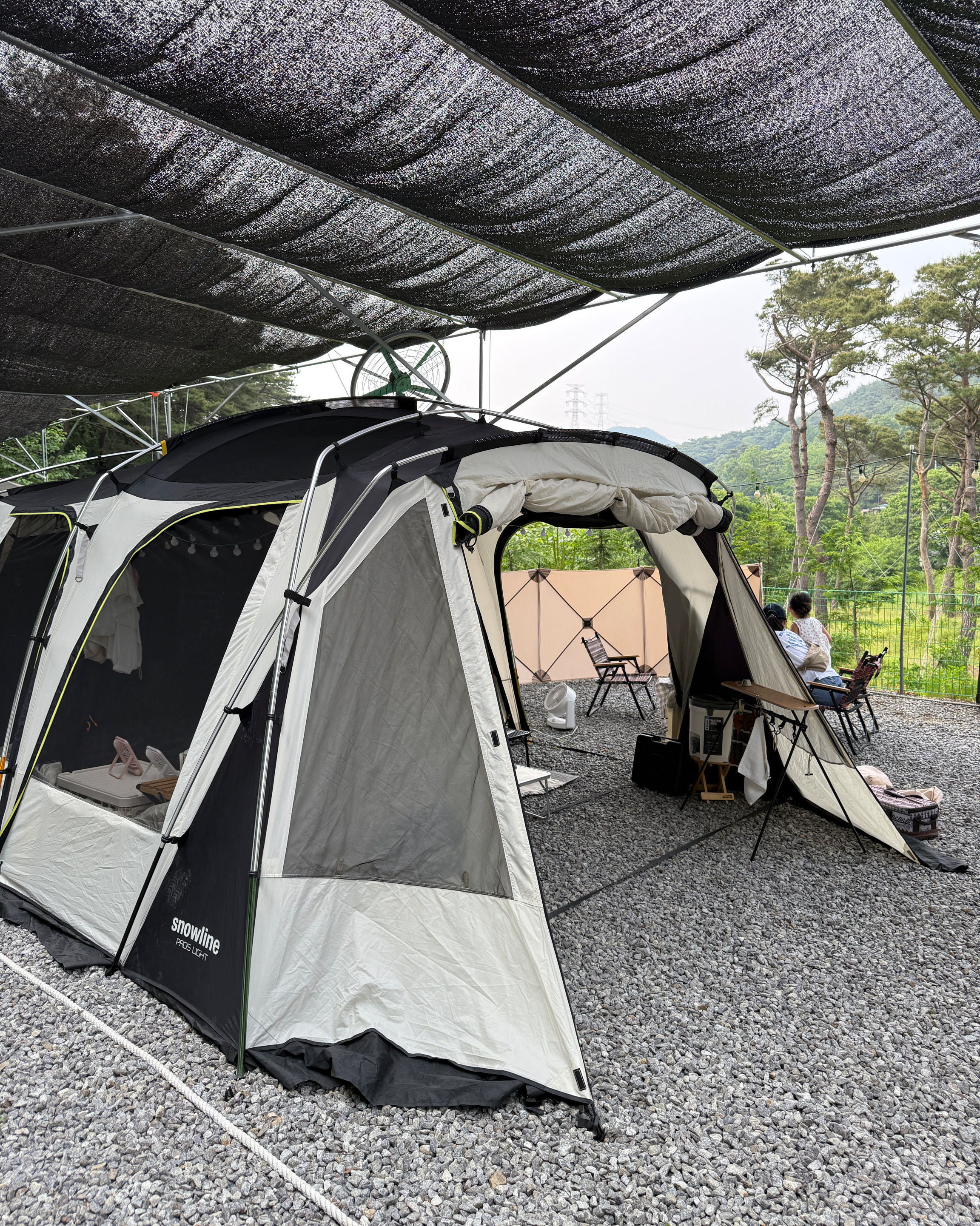 차양막이 있어서 해 피하기 너무 좋았어요(차양막도 자바라? 처럼 사용가능한듯해요 대신 사이트 2-3개가 엮여있었어요)