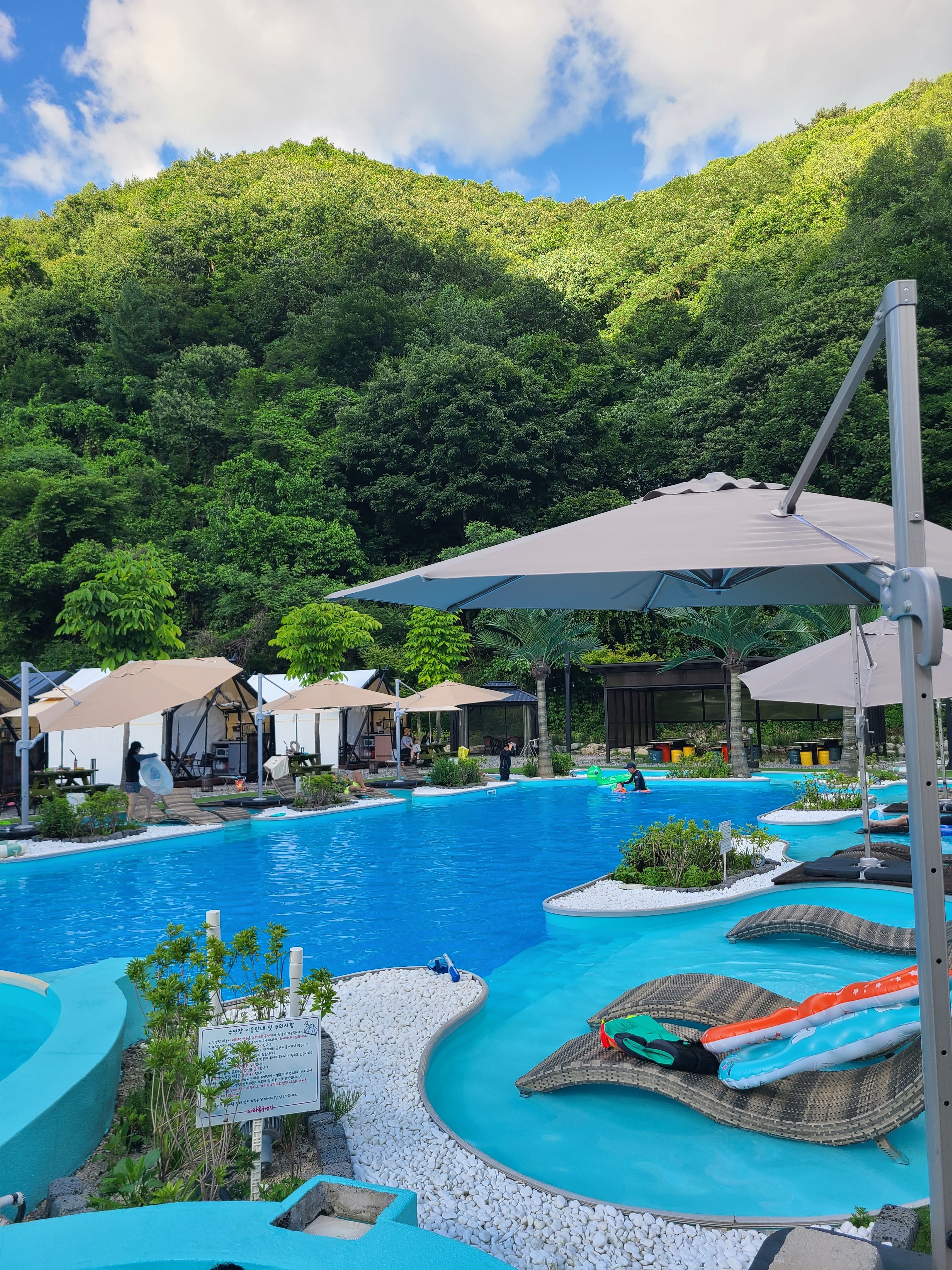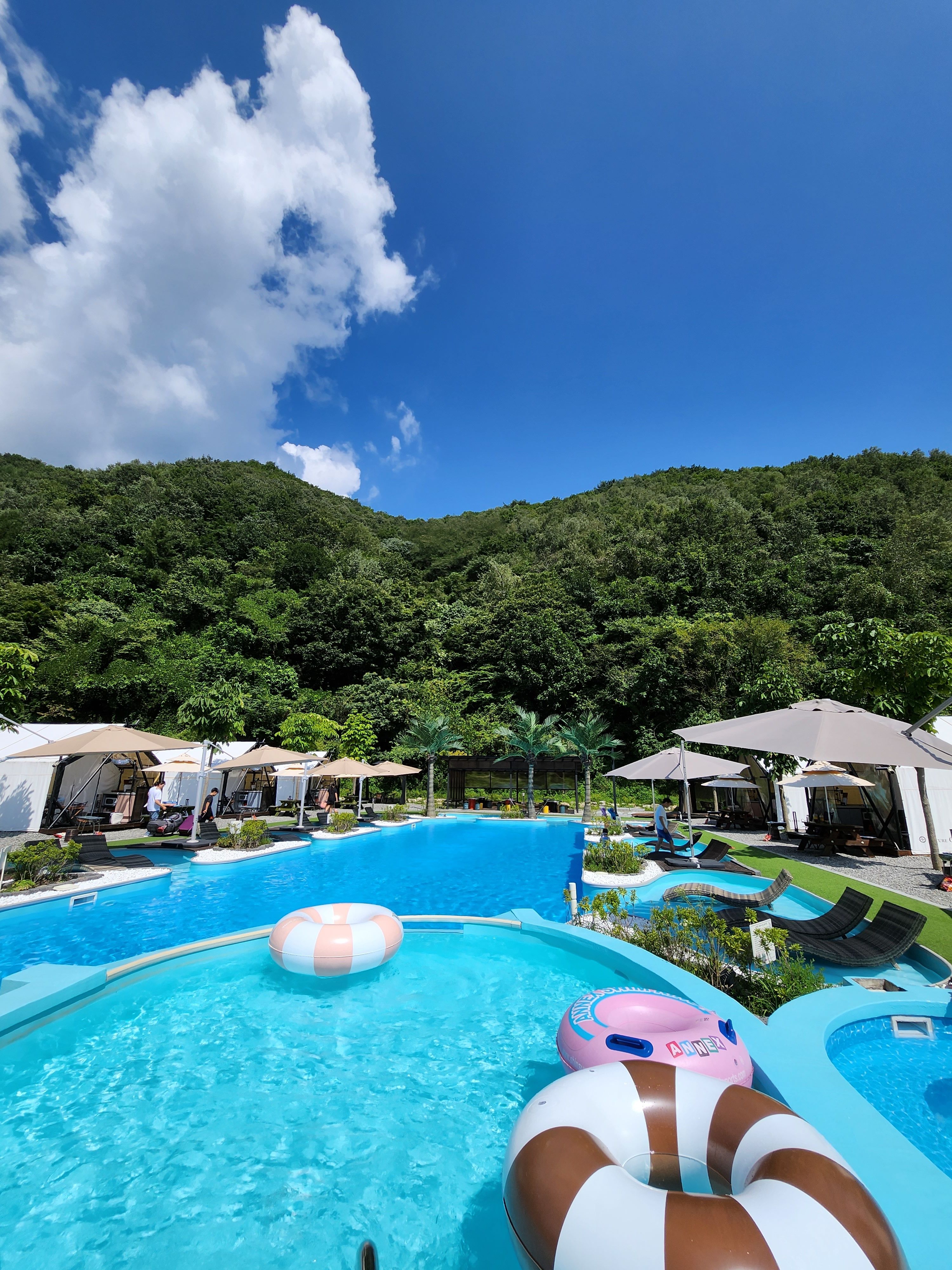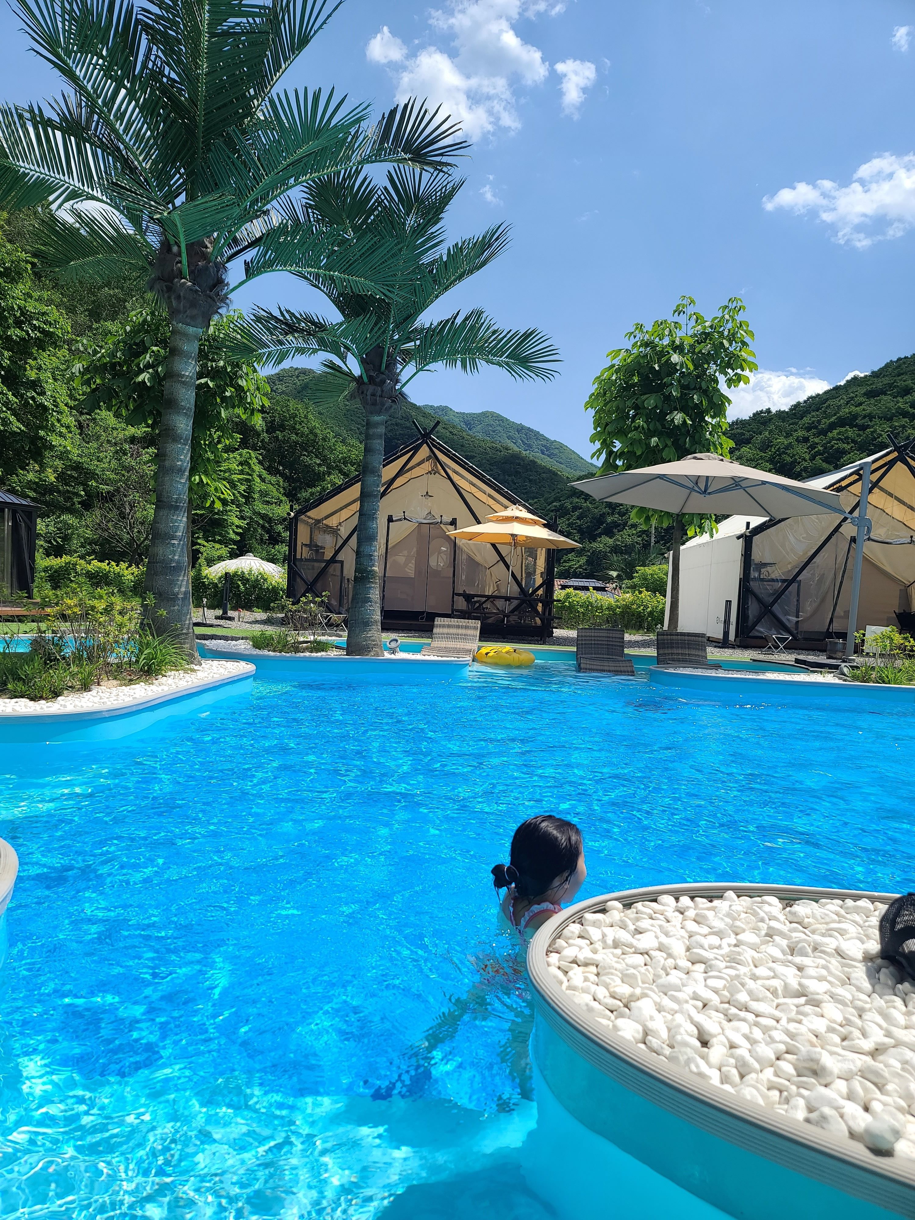 글랭핑 내부도 깨끗하고 바로 앞에 수영장이고 개별 썬베드와 개별공간이 있어서 물놀이 하기 너무 편해요.