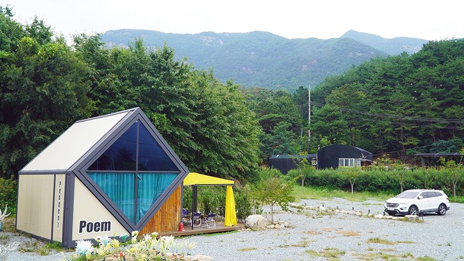 글램핑포엠은 경북 청도군 매전면 장연리에 자리 잡았다. 청도군청을 기점으로 20km가량 떨어졌다. 자동차를 타고 청려로와 청매로를 번갈아 달리면 닿는다. 도착까지 걸리는 시간은 20분 안팎이다. 캠핑장에는 한글, 큐브, 펜던트란 명칭을 지닌 글램핑 10개 동이 마련돼 있다. 내부에는 침대, TV, 테이블, 개수대, 취사도구, 조리도구, 화장실, 샤워실 등 일상생활이 가능할 정도의 시설이 완비돼 있다. 주변에는 운문산군립공원이 있어 연계 관광이 손쉽다.