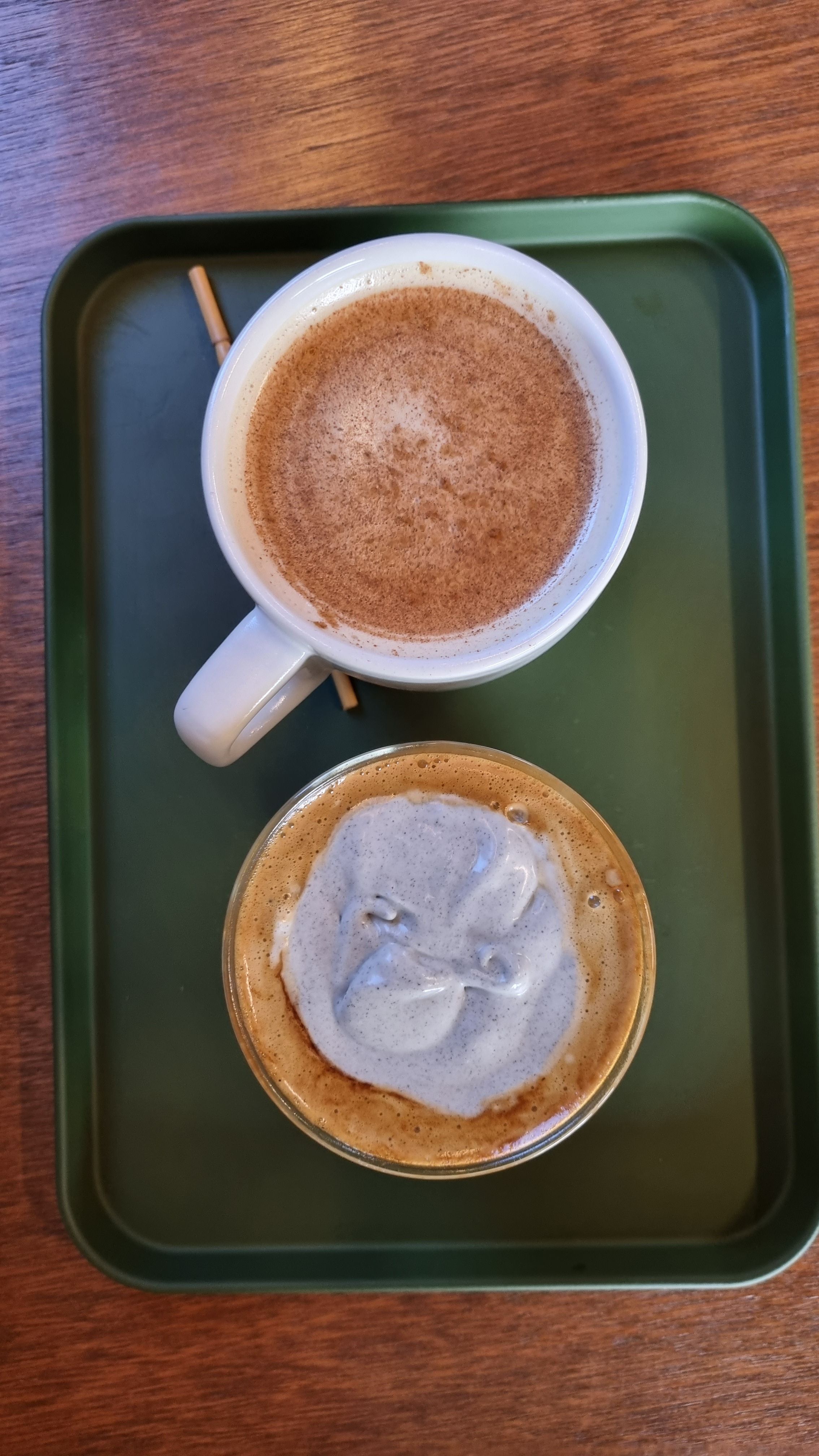 와바라 커피는 라떼에 시나몬 가루 뿌린거고 곰신라떼는 에스프레소에 흑임자 크림 올려져 있고 아이스만 됩니당~ 곰신라떼가 정말 너무 맛있어요!