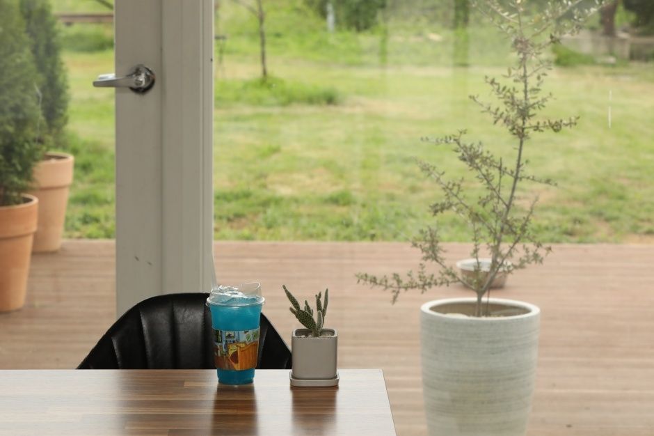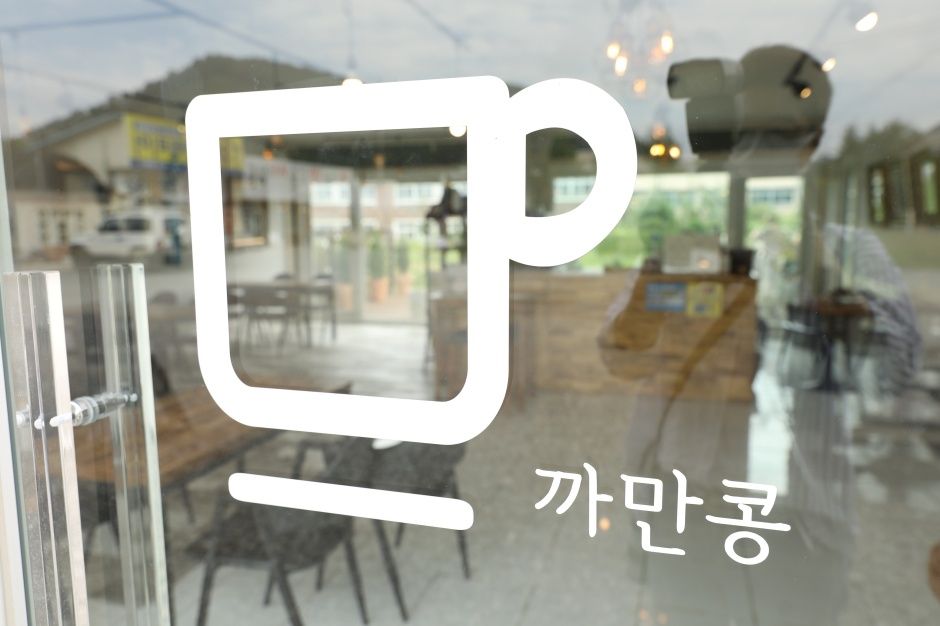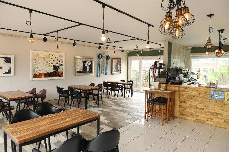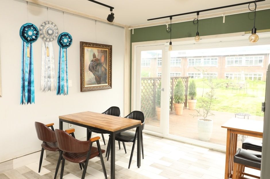 그림작품이 전시되어 있는 넓은 마당이 한눈에 보이는 반려견 동반 가능한 카페 까만콩입니다.