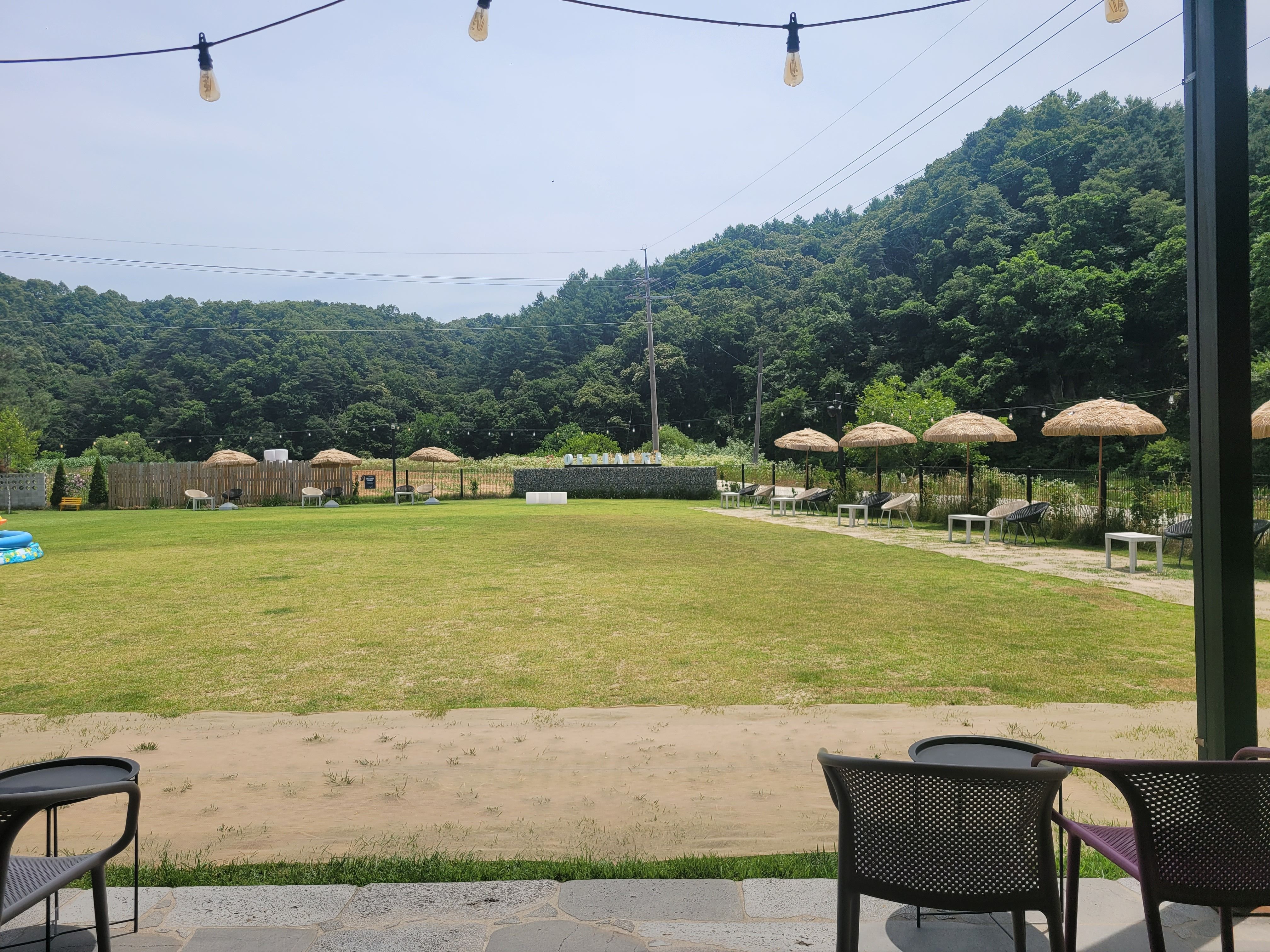 강아지들이 자유롭게 뛰어놀기 좋은 넓은 잔디밭과 그 뒤로 보이는 산과 하늘을 보며 힐링 제대로 했습니다!!