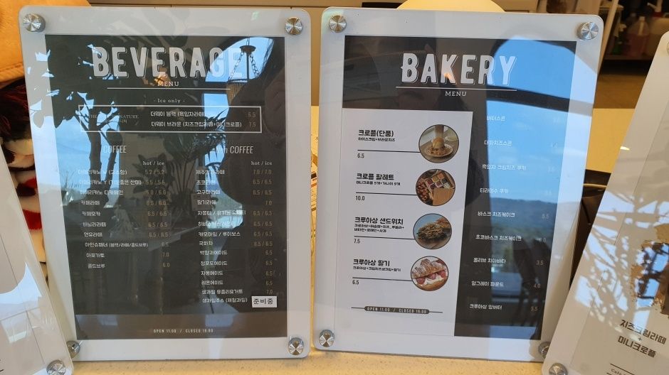 - 크로아상 샌드위치 7,500원- 크로플 6,500원- 더웨이 블랙 7,000원- 디저트 3,000~7,500- 크로플 팔레트 10,000원- 아메리카노 W 5,200원- 아메리카노 Y 5,500원
