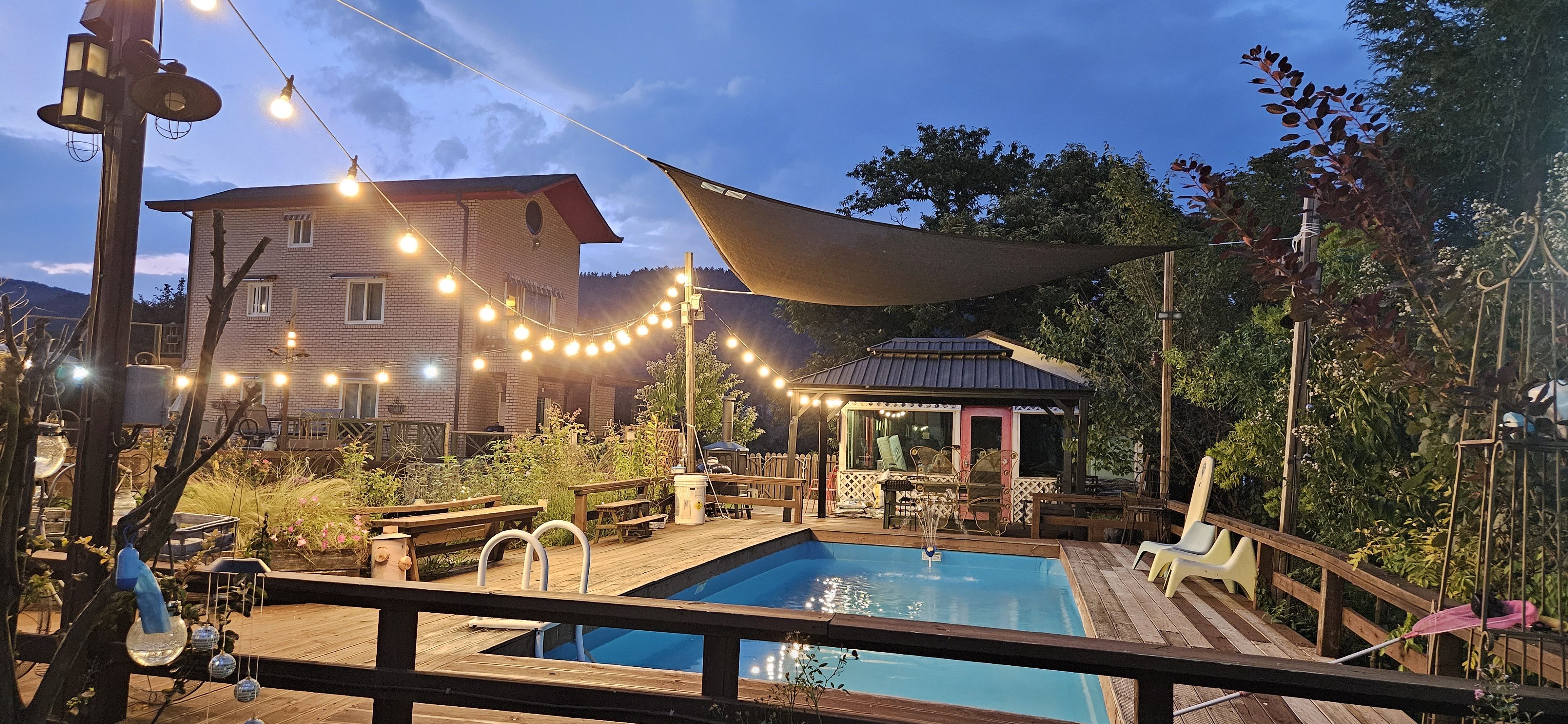 올해 6월말쯤 방문하고 실내수영장에서 신나게 잘 놀았었는데 이번엔 실외수영장에서 놀아보고자 마침 회사동료랑 재방문을 하게 되었습니다. 기대대로 날씨는 좋았는데 다만 수영장물이 지하수라 무지 차가워 나중엔 춥더라고요. 저녁엔 근사하고, 쁘띠하게 멋진 바베큐파티 잘 했구요^^ 고기까지 맛나게 구워주셔서 감사했습니다.😄