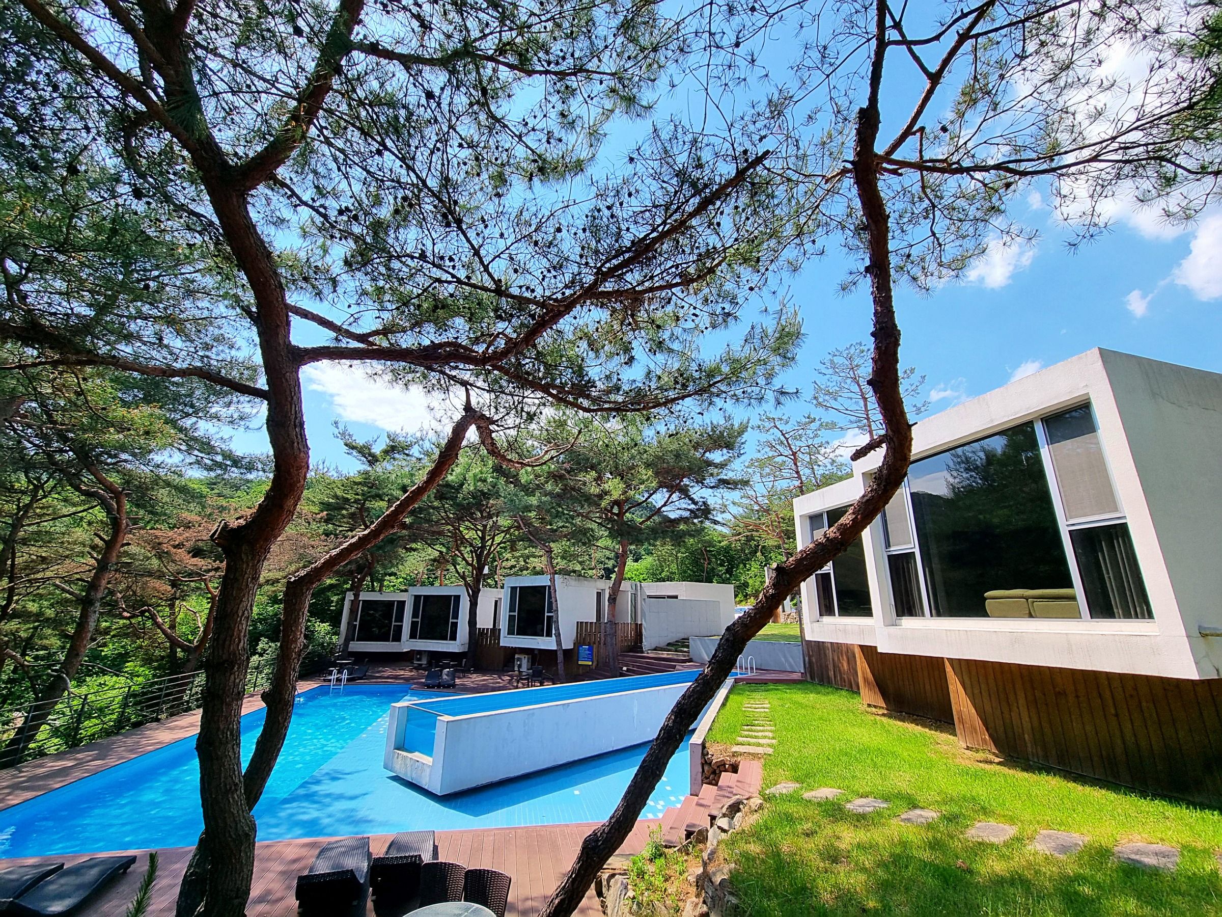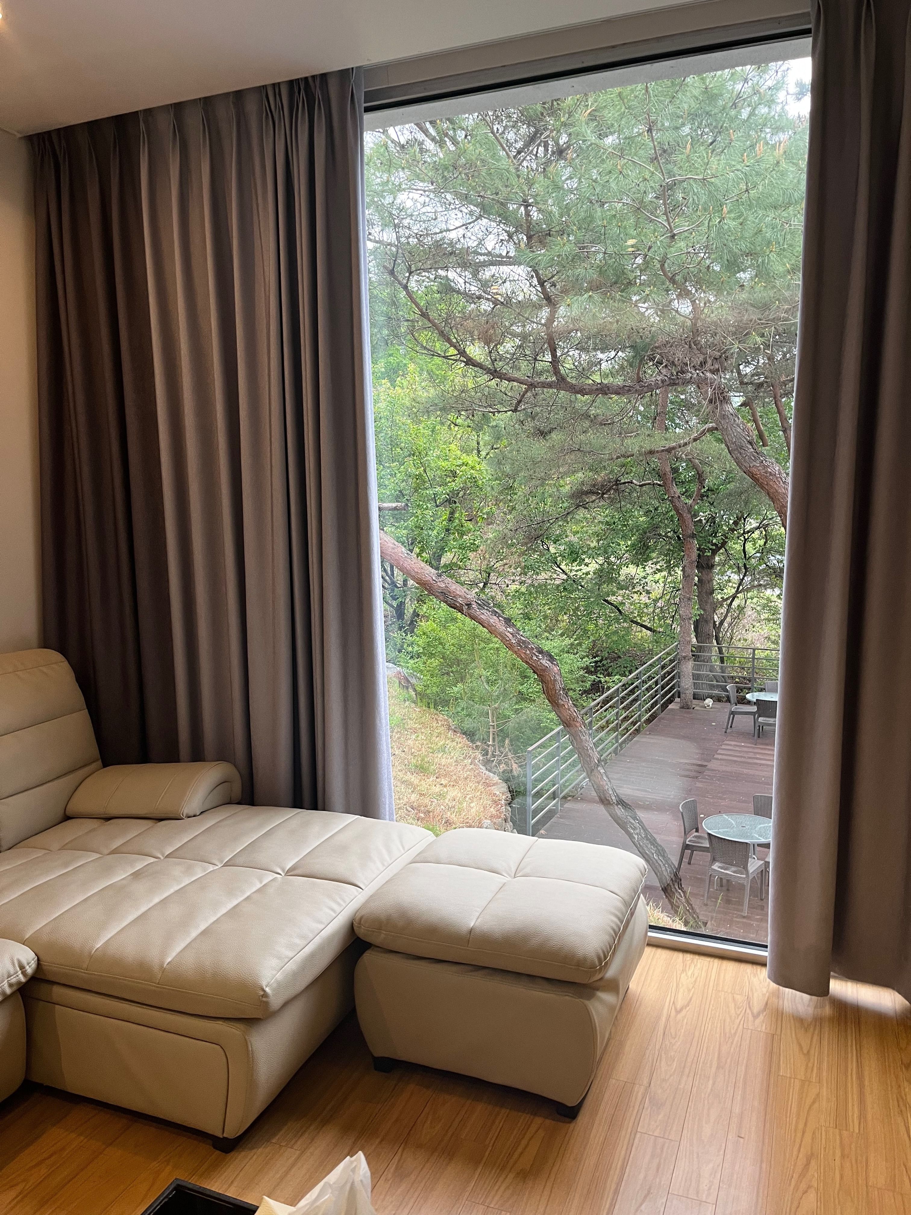 더 오래 머물고 싶을만큼 고요하고 아름다운 곳이었어요. 구조나 인테리어가 감동을 줄 수 있다는 걸 여기와서 느꼈습니다. 수영장도 웬만한 대형 펜션만큼 커서 물놀이도 실컷 했어요. 특히 저희가 머문 방 안의 중간창이 좋았어요. 저라면 의자나 소파에 앉아 하루종일이라도 그 창밖의 숲을 보며 쉴 수도 있을 것 같아요.한밤중에 체한 아이 때문에 약을 구하려고 전화드렸는데 도와주셔서 정말 고마웠습니다. 일하시는 분들의 친절 덕분에 더 행복한 휴가였습니다.