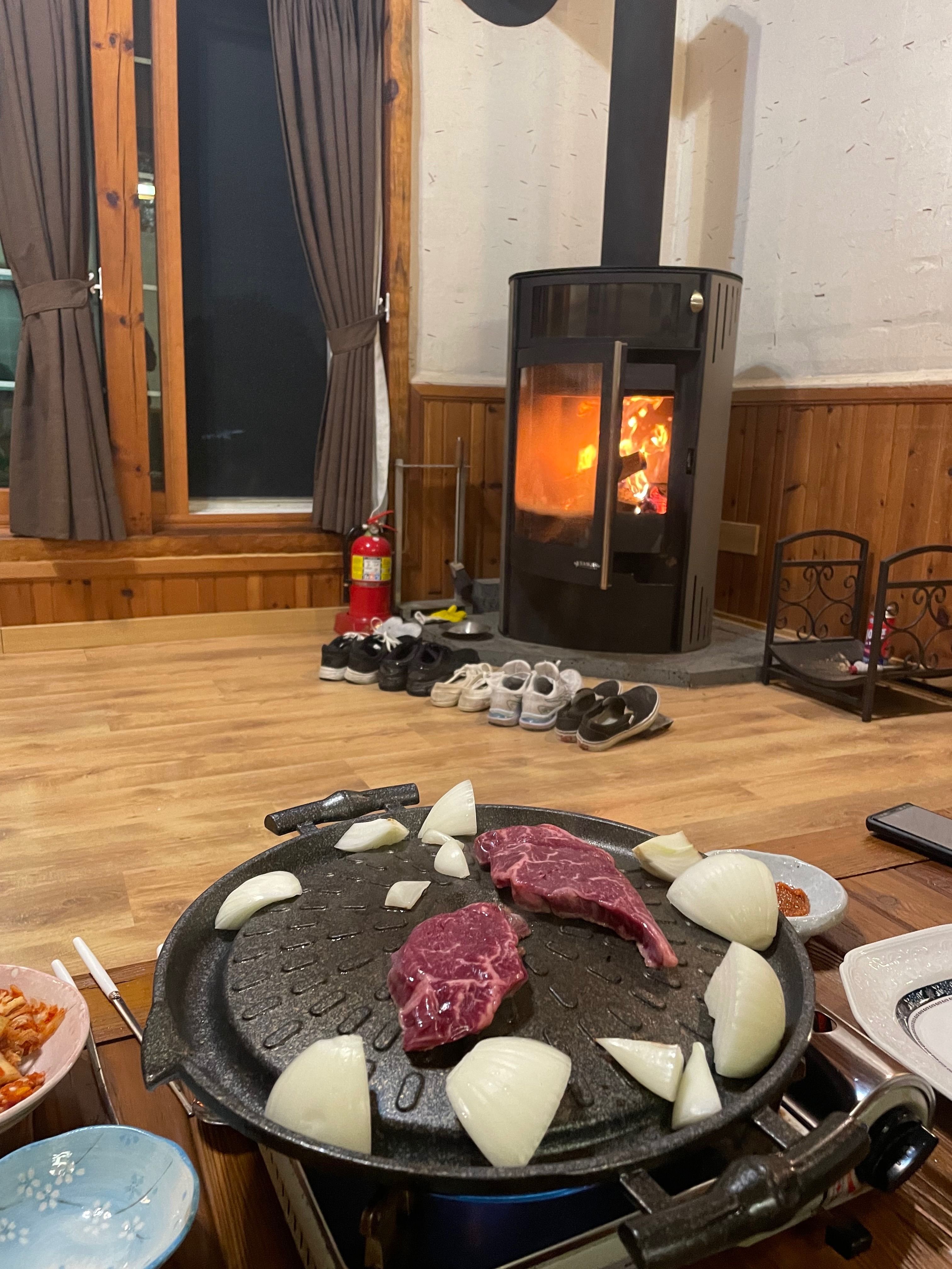 제일 맘에 들었던 점은 거실에 있던 난로 사용이였어요. 가져간 캠핑 테이블 놓고 난로 앞에서 와인 마시며 또 좋은 시간 만들었구요❤️🔥