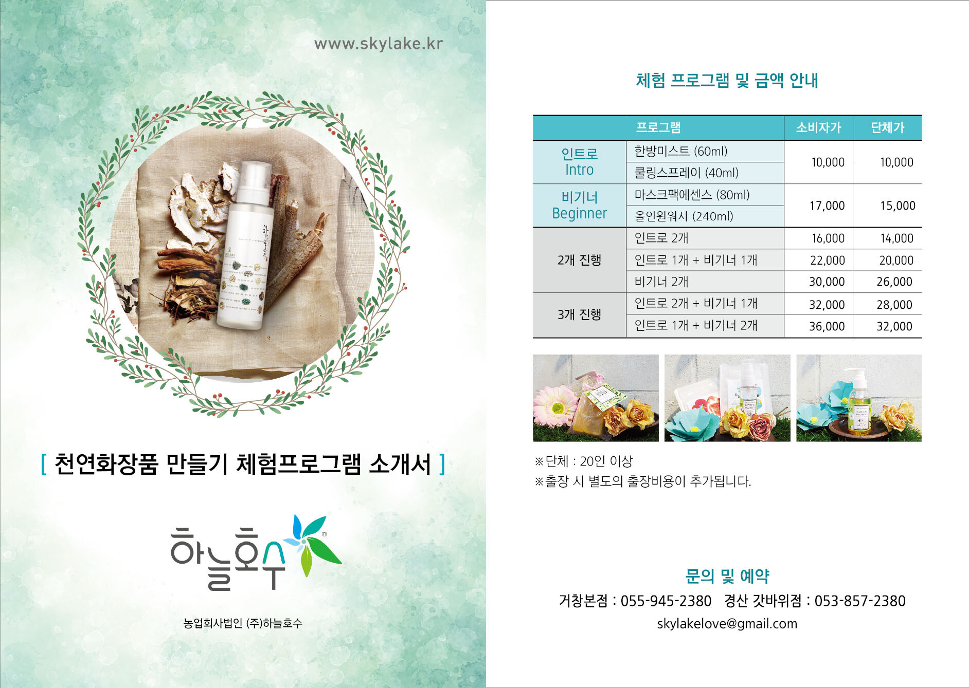 경남 거창의 덕유산 자락에 자리잡은 20년의 천연허브화장품 제조&유통 전문기업 하늘호수에서 자사의 노하우로 만든 천연화장품만들기 체험프로그램을 운영중이다. 한국관광공사 웰니스시설로도 선정되어 있고, 스킨, 에센스, 올인원워시 만들기 등을 직접 해볼 수 있으며, 체험 후엔 코스메틱카페에서 차를 즐길수 있다. 또한 체험당일에 한해서 하늘호수의 화장품을 할인된 가격으로 구매해 볼수도 있다. 예약은 필수다.