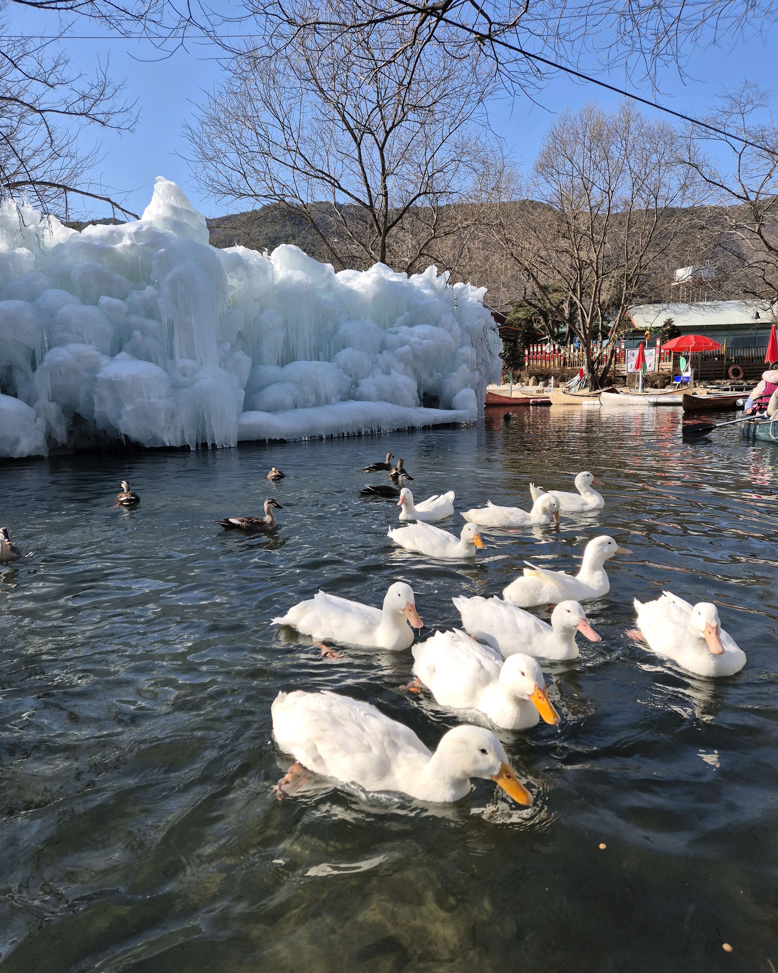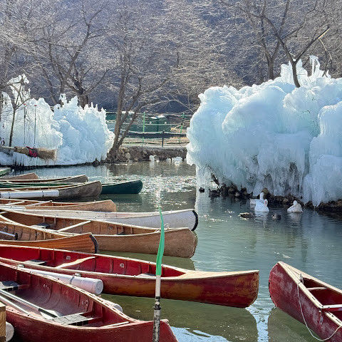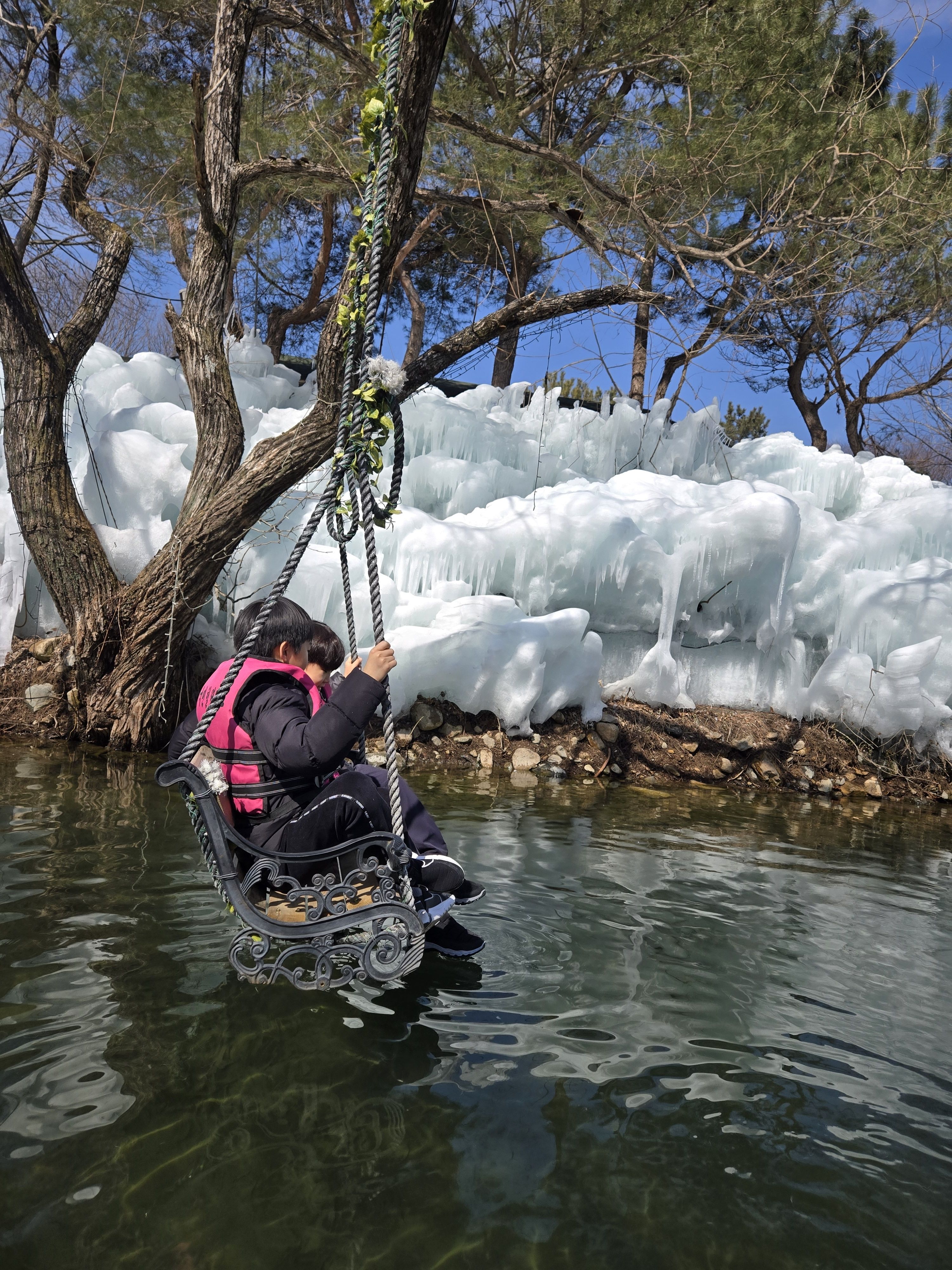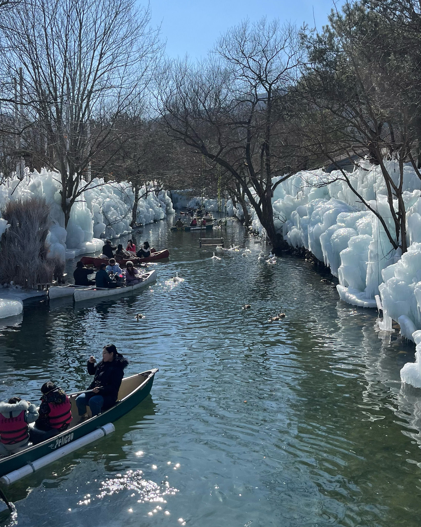 카누를 타려면 1인당 15,000원입니다. 현금만 받거나 CC를 선호하는 경우 입구에 가서 비용을 지불한 후 영수증을 카누 장소로 가져가야 합니다. 얼음 호수 한가운데에는 사진을 찍을 수 있는 여러 개의 좌석이나 그네가 있지만, 카누에서 내려야 합니다. 제 경험으로는 유아와 함께 있었기 때문에 불가능했습니다. 유아에게는 구명조끼를 주는데 어른도 빌릴 수 있어요. 백조에게도 먹이를 줄 음식을 줍니다!