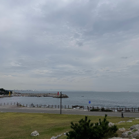 흐린 날이라 푸른 바다와 하늘을 제대로 담을 수 없었어요. 떠나려고 하니 햇살이 조금씩 더 밝아지기 시작했어요. 💕 그래도 바다에 반짝이는 햇살은 정말 아름다웠어요.