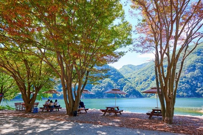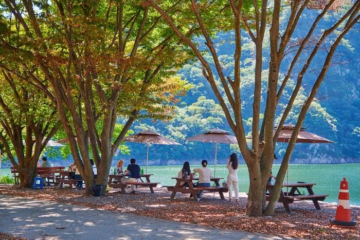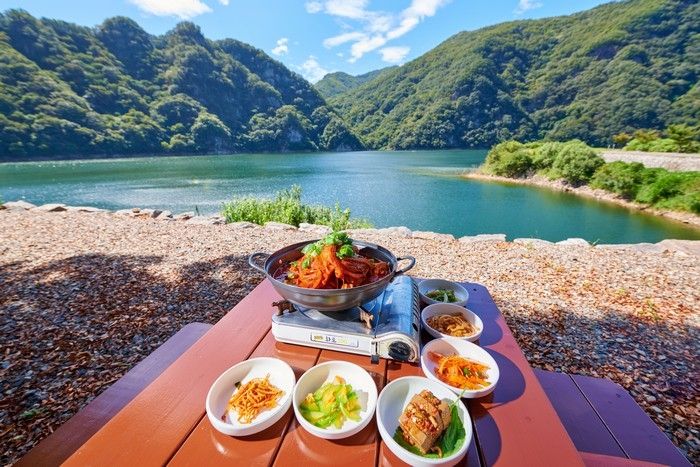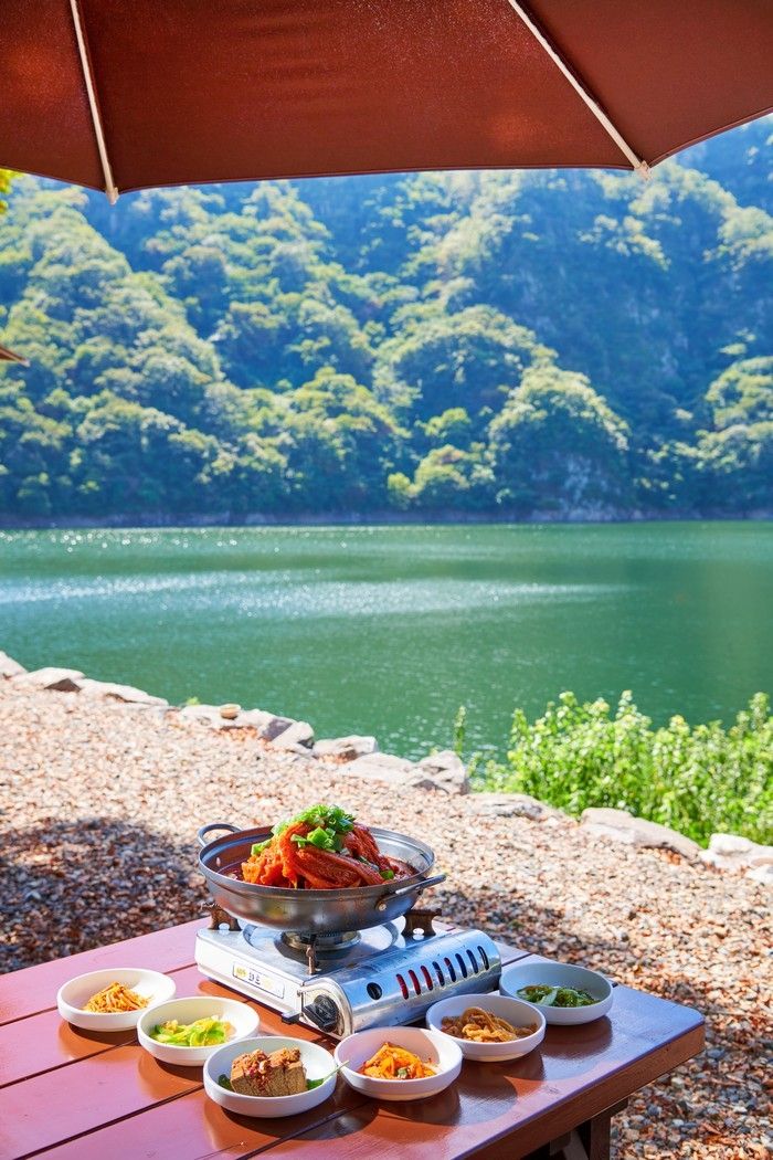 저수지를 배경으로 즐기는 닭요리