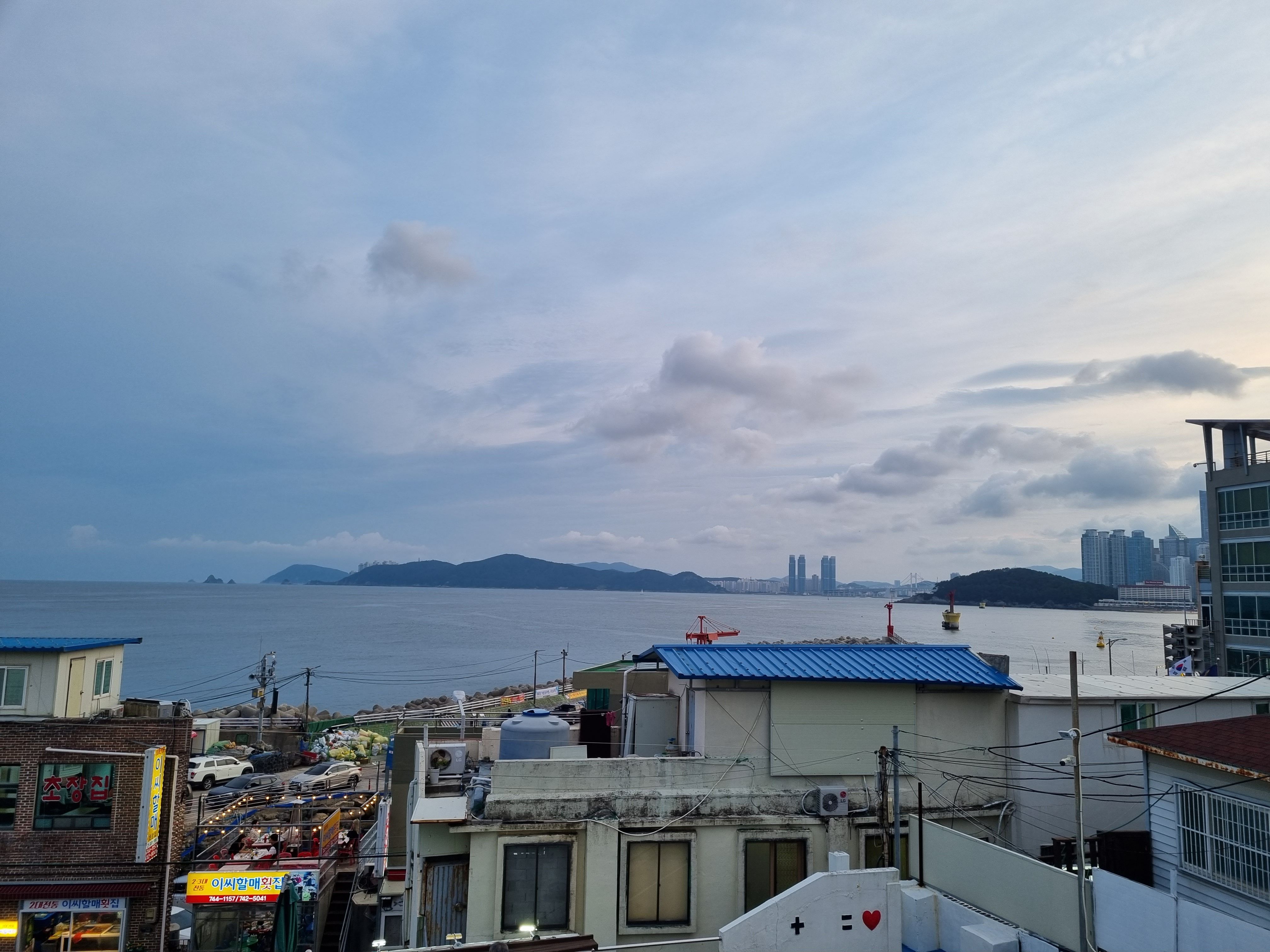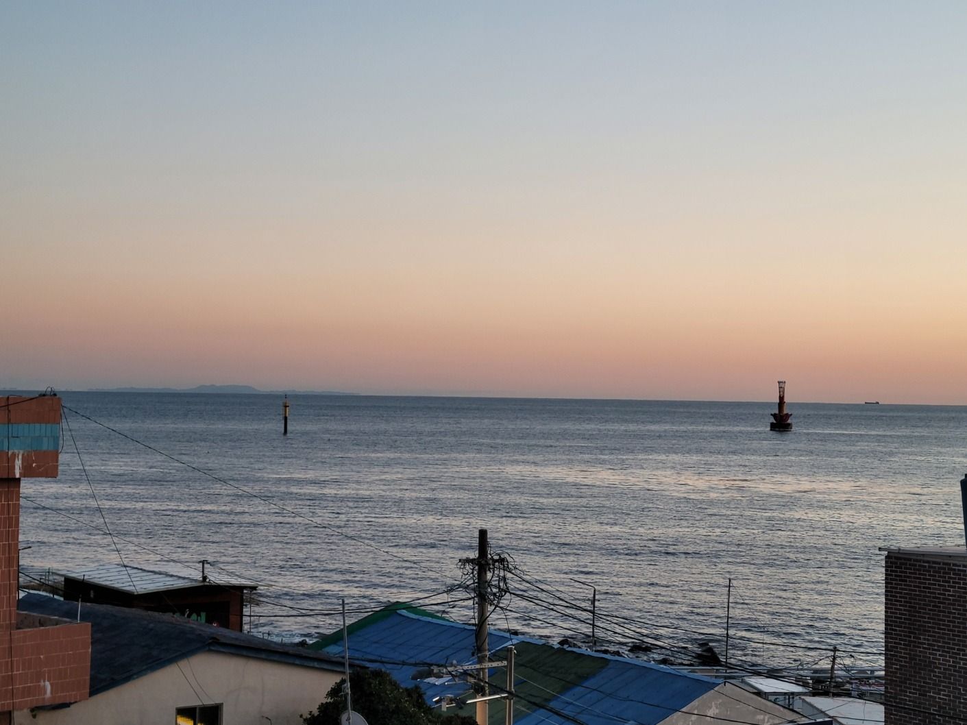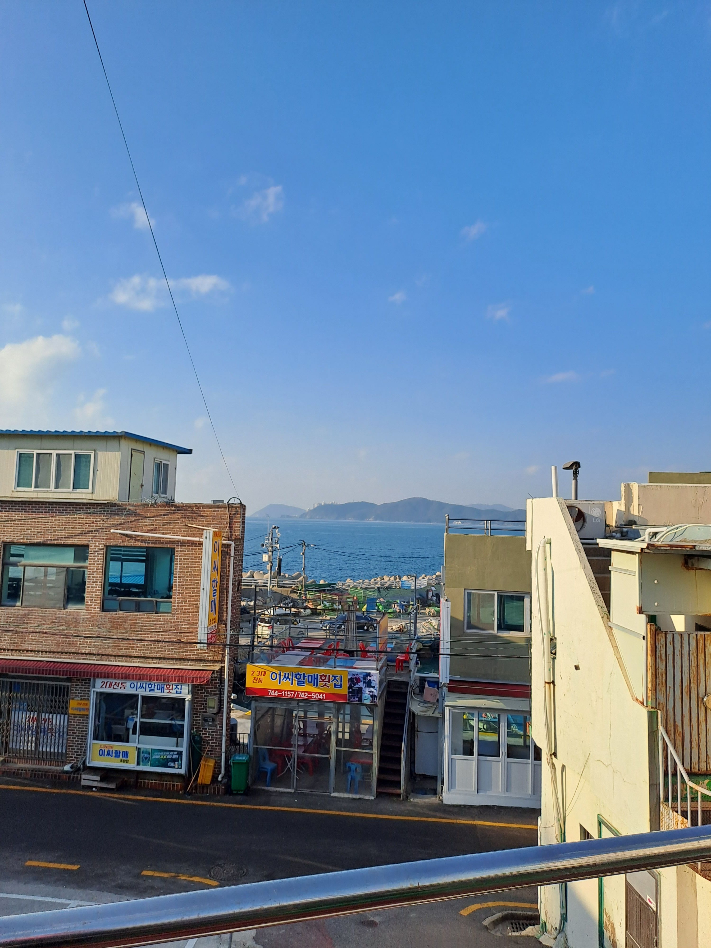 펜션 설명도 여기저기 열심히 해주셨고 옥상에서 바베큐 가능하고, 날씨 좋은날은 대마도, 오륙도 등 다~ 보인다고 아~주 친절히 안내해주셨습니다. (사진은..옥상에서 촬영, 저멀리 대마도..)