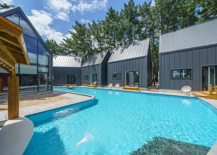 히든포레스트는 경상북도 포항 화진해수욕장 앞에 자리해, 끝없이 펼쳐지는 푸른 바다를 품고 있다. 객실마다 온수풀이 있어 물놀이를 즐기기에 좋고, 히든포레스트 동 대부분 객실에는 스파가 있어 피로와 스트레스를 풀 수 있다.