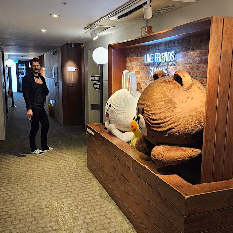 이번에는 라인프렌즈 테마 스위트룸에 묵었습니다. 방 구조가 정말 귀엽네요. 안타깝게도 외부 창문에는 완전히 열리지 않는 고정 커튼이 있습니다. 나무 욕조에서 물이 새네요. 화장실용품은 다 있는데 칫솔이나 치약은 없어요. 카운터에서 구입하실 수 있습니다. 헤어 드라이어는 불기가 어렵고, 매우 뜨겁고 시끄럽습니다. 카운터 직원분도 친절하시고, 로비 접수처에서는 일본 관광객과 한국 관광객들에게만 인사를 해주는 것 같아요~