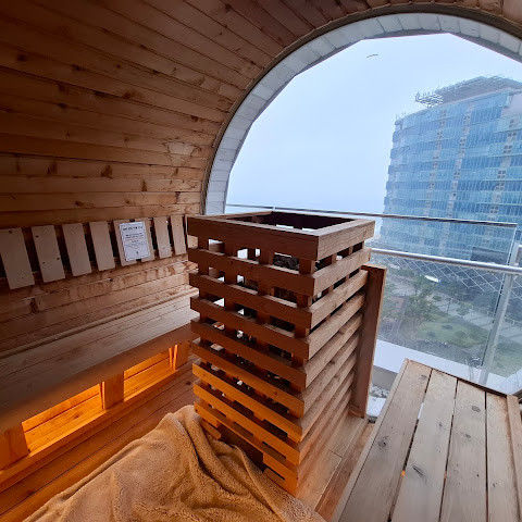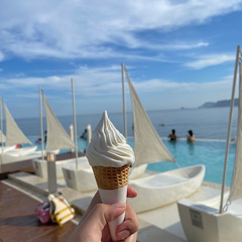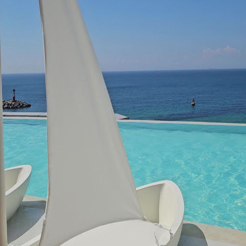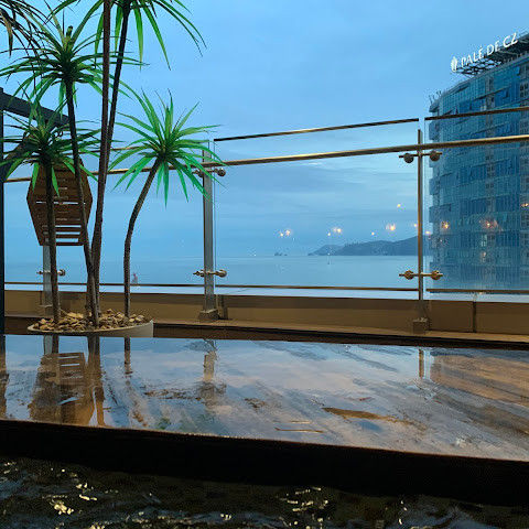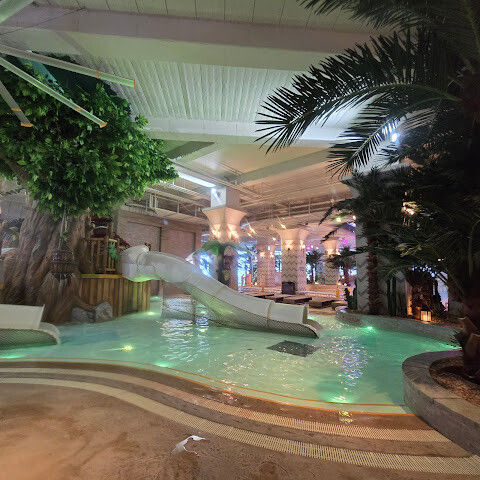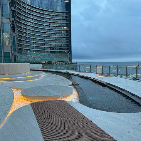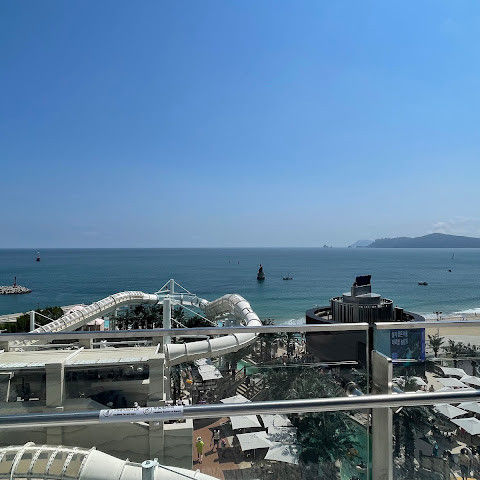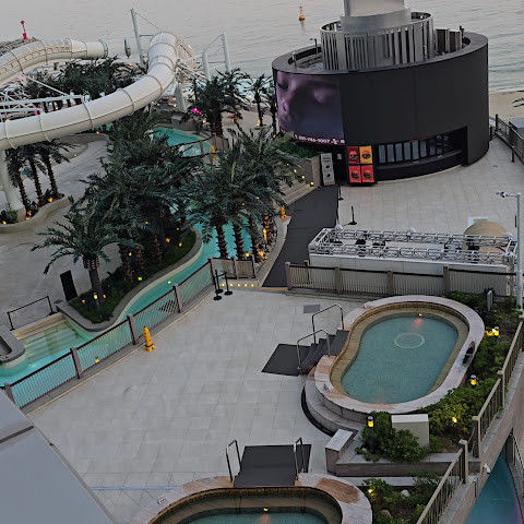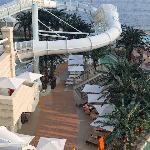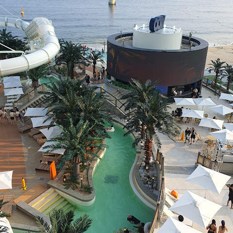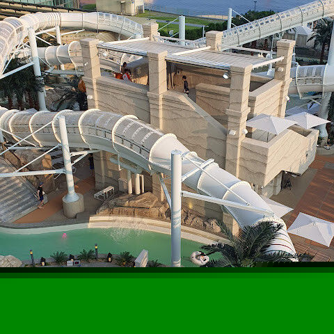 아름다운 인피니티 풀과 멋진 해변 전망을 자랑하는 작은 워터파크입니다. 워터슬라이드는 재밌지만 줄이 꽤 길어요. 시설은 괜찮고, 위층 사우나도 아주 좋아요.