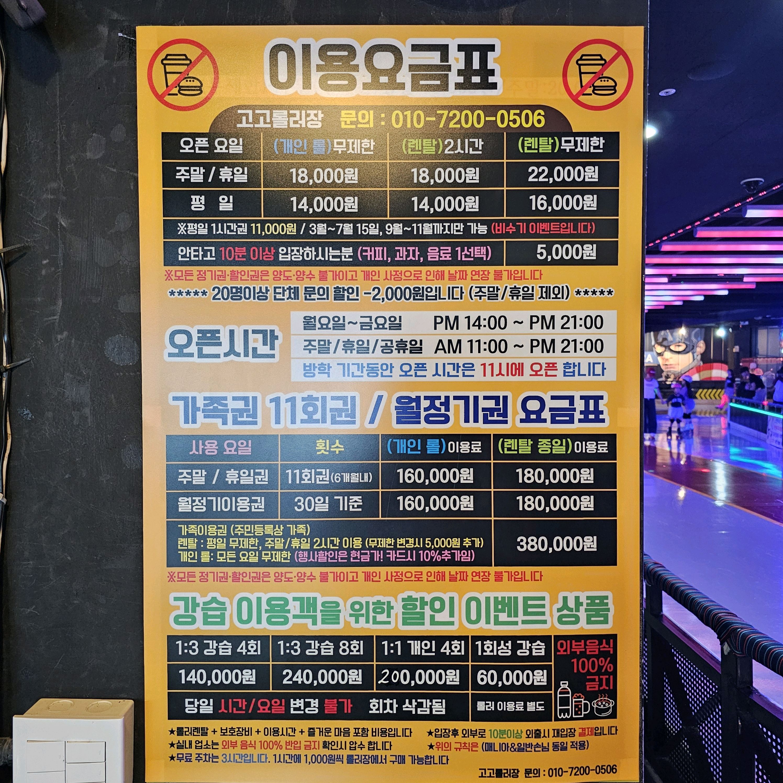 고고롤러스케이트장에는 롤러사이즈가 130~310까지 다양하게 준비되어 있어 아이와 함께 가기 좋은 곡입니다 👍 실내라 날씨에 영향을 받지 않아 실내데이트 하기도 좋습니다 ㅎㅎ 500평 규모의 넓은 실내에 보조기가 구비되어 있는 왕초보존부터 고수존까지 있어 남녀노소 초보자부터 고수까지 즐기기 좋습니다 👍