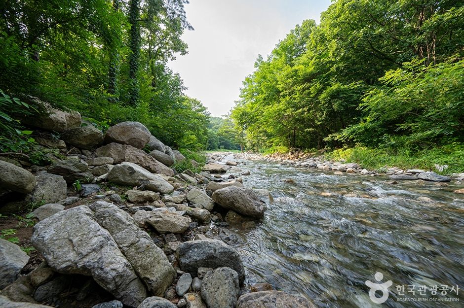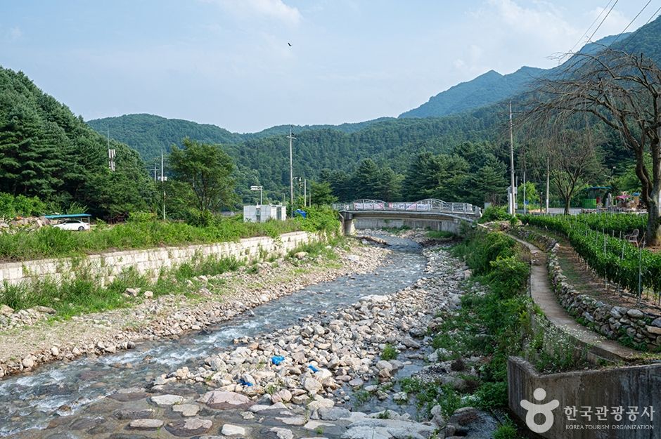 지장산계곡은 얼음같이 차가운 물이 5km를 흘러 한탄강으로 유입된다. 계곡 입구 왼쪽으로 병풍처럼 깎아지른 절벽 사이로 키 작은 소나무가 자라고, 절벽 위에는 궁예의 옛 성터가 남아 있다. 계류를 따라 차가 다닐 만한 길이 나 있고 계류 양 옆으로 대전기, 가산산성, 대궐터 등의 문화유적지가 훝어져 있다. 지장산계곡은 자연그늘이 많고, 등산로가 잘 되어있어 카트에 짐을 싣고 걸어서 올라가기 편하여 여름철이면 피서객들로 붐비는 곳이다. 인근에는 교동마을과 숯골마을이 있다. |
