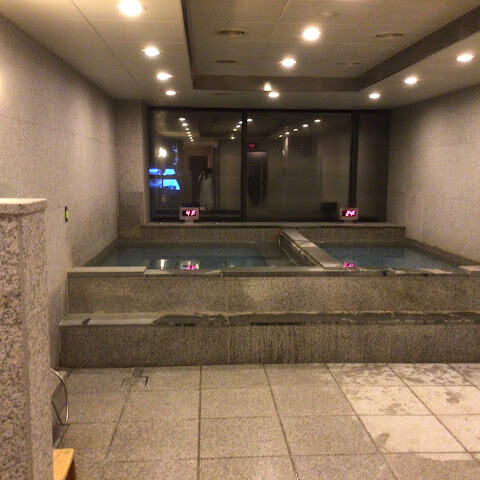 온탕은 42도(3m x 3m)이고, 냉탕은 24도(1.5m x 3m)입니다. 건식 사우나는 28도(33도)입니다. 전자기기 사용은 금지되어 있습니다.