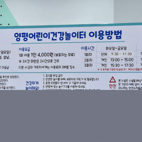 양평 어린이건강놀이터는 아이들이 마음껏 뛰어놀 수 있는 실내 공공 놀이시설로, 정글짐, 클라이밍, 하늘그물놀이 등 신체활동 공간과 미디어 놀이존, 모래놀이까지 다양하게 갖추고 있습니다. 깨끗하고 넓은 공간에 안전요원이 상주하여 안심하며 이용할 수 있으며, 저렴한 이용료와 넉넉한 주차 공간도 큰 장점입니다. 주말에는 예약이 빠르게 마감되니 미리 예약하고 방문하시면 더 좋더군요.