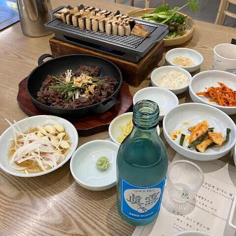 가격이 좀 비싸긴 해요. 음식은 구워서 나오고, 양상추는 무제한으로 리필 가능해요 (종류도 꽤 다양해요).
