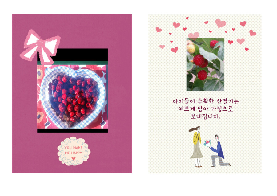 입구에 들어서면 영롱한 루비 같은 산딸기가 판매대에 놓여 있고, 한 가족당 한 이랑에서 산딸기를 딸 수 있게 가꾼 농장이 나온다. 체험을 진행하는 동안 과일을 따면서 맛을 볼 수 있고 딴 것을 가져갈 수 있게 포장용기를 제공한다. 도시생활을 하는 아이들에게 즐겁고 맛있는 색다른 경험을 주는 최고의 놀이터이자 배움터인 주말농장이다. 근처 차량 10분 거리에 안성맞춤랜드와 금광호수공원이 있어 가족과 나들이하기에 좋다. |