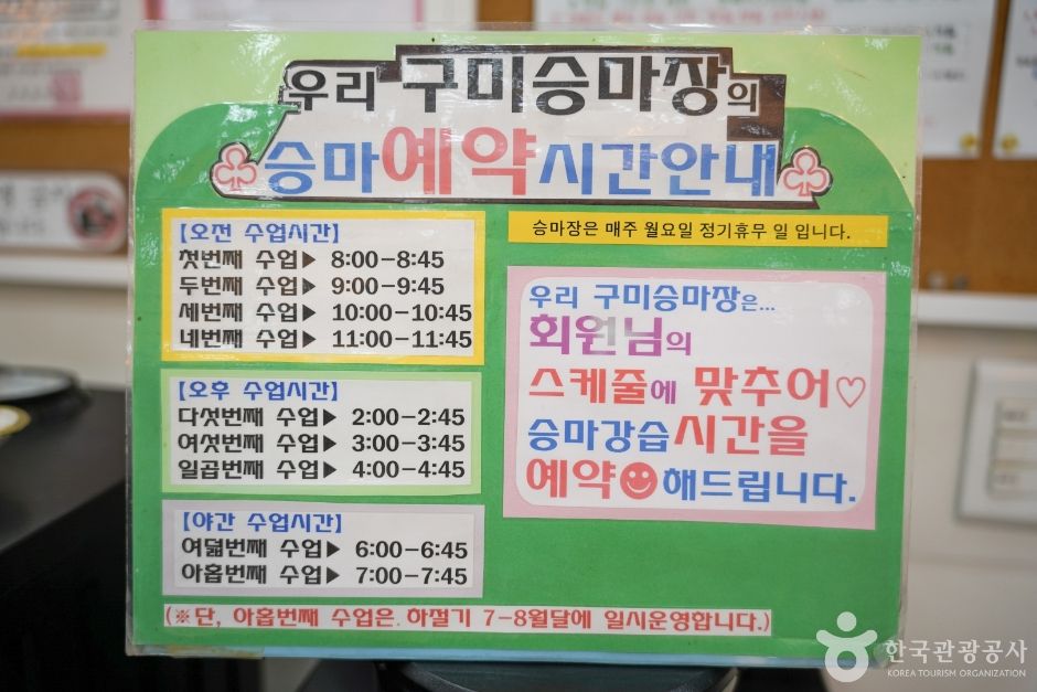 구미시설공단에서 운영하는 ‘구미시승마장’은 국제승마대회 유치가 가능한 규모의 국제 공인 승마장으로 전국학생선수권대회와 대통령배 전국승마대회를 개최하는 대형 승마장이다. 체계적이고 전문화된 승마훈련을 받은 후 각종 유소년 전국승마대회에 참가할 기회를 제공하는 유소년 승마단 육성 프로그램과 아동, 청소년, 성인 대상의 개인 승마 강습과 1일 승마강습 · 승마체험을 운영한다.