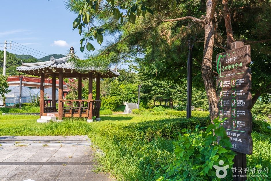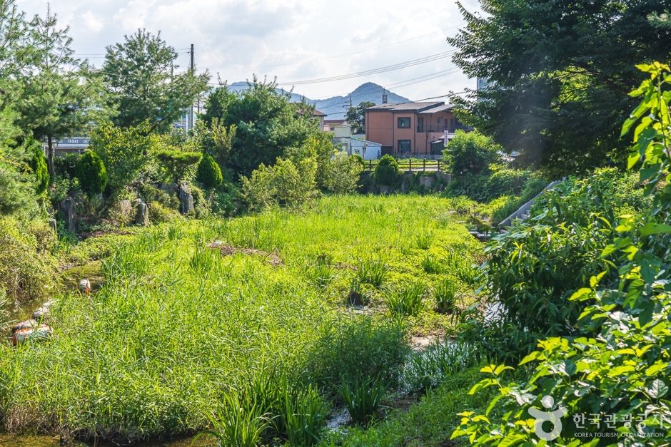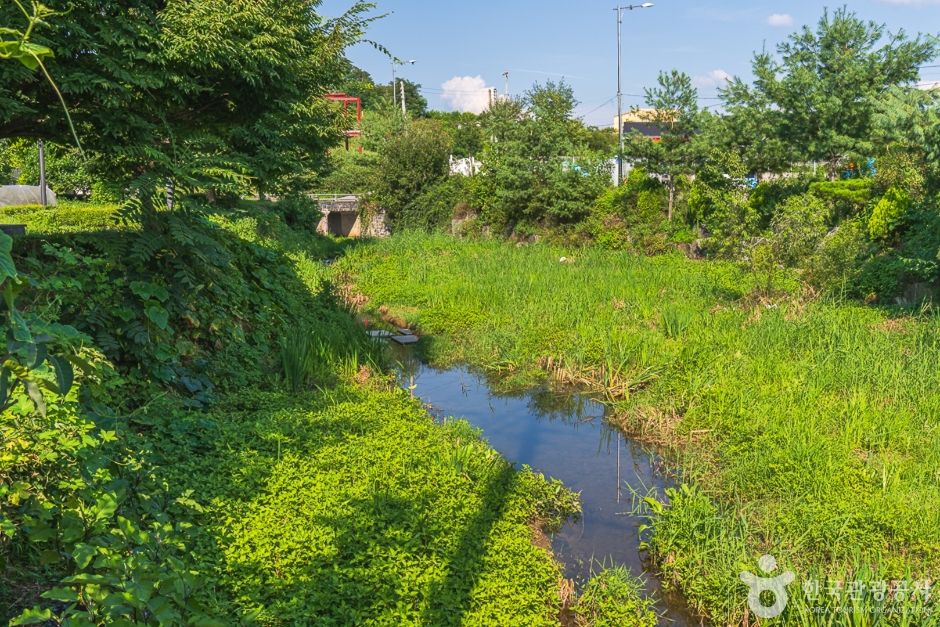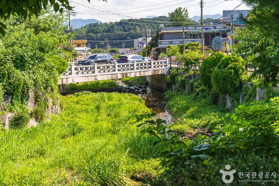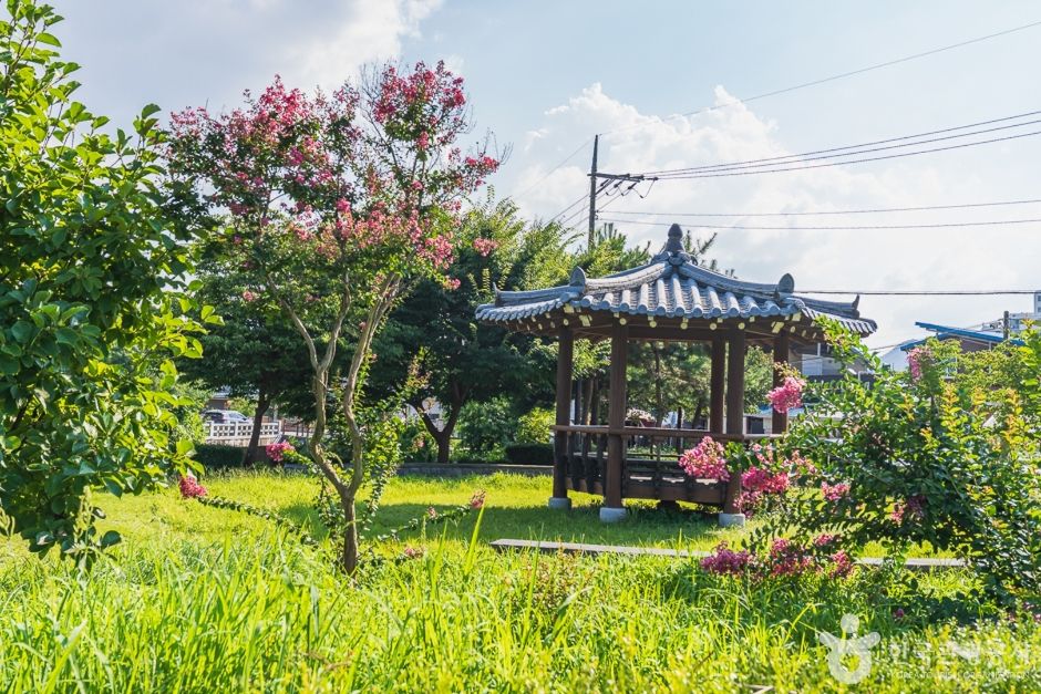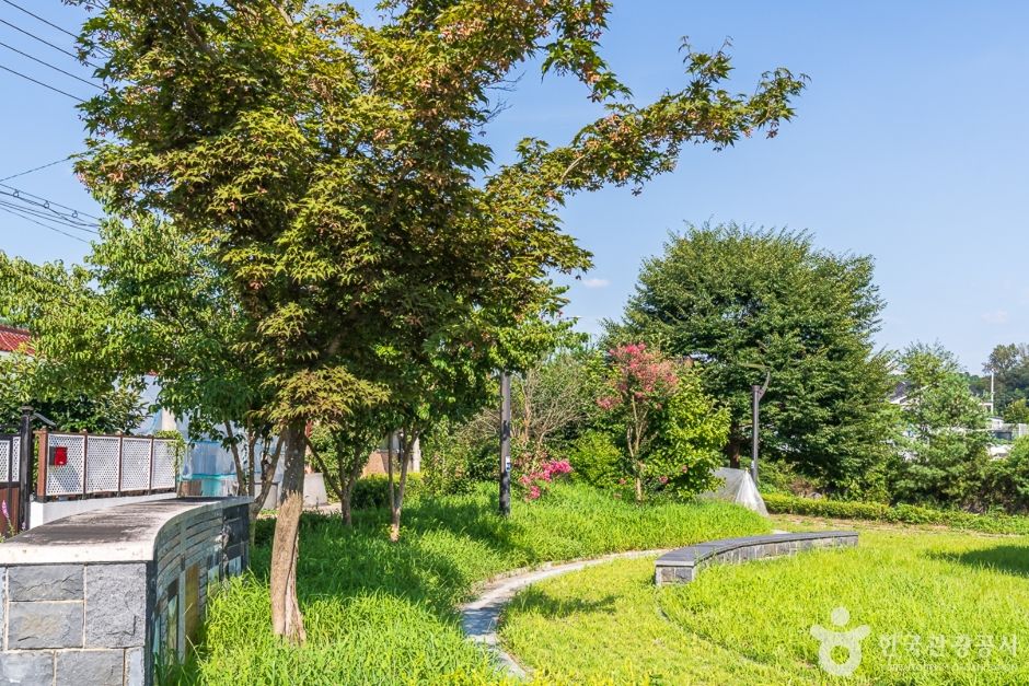 친수 테마공원은 실개천 옆 옥천군 구읍에 자리한 곳으로 교동 저수지에서부터 흘러나오는 물은 이곳을 거쳐 정지용 시인의 생가로 이어진다. 중앙에는 쉴 수 있는 정자가 있고, 주변은 낮은 담장이 어우러진 공원이다. 공원 앞으로 흐르는 실개천이 시골 풍경과 어우러져 마음을 평안하게 해주며 실개천으로 내려가는 계단이 만들어져 있어서 물가에 다가갈 수 있고, 개천을 건널 수 있는 징검다리도 있어 마음 편히 거닐며 사색하기 좋다.