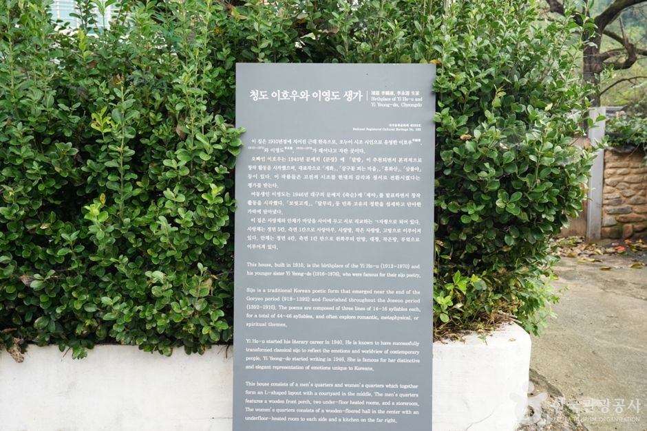 청도 이호우와 이영도 생가는 1910년경에 건축된 단층 한옥 기와집으로 현대 시조의 격을 한 차원 높인 것으로 평가받고 있는 시조 시인인 이호우(1912∼1970)와 여동생인 이영도(1916∼1976)가 태어나고 성장한 주택이다. 안채와 사랑채가 [ㄱ 자형]으로 구성되어 있다. 사랑채는 정면 5칸, 측면 1칸으로 사랑마루, 사랑방, 작은 사랑방, 고방으로 이루어져 있다. 안채는 정면 4칸, 측면 1칸 반으로 왼쪽부터 안방, 대청, 작은방, 부엌으로 이루어져 있다.