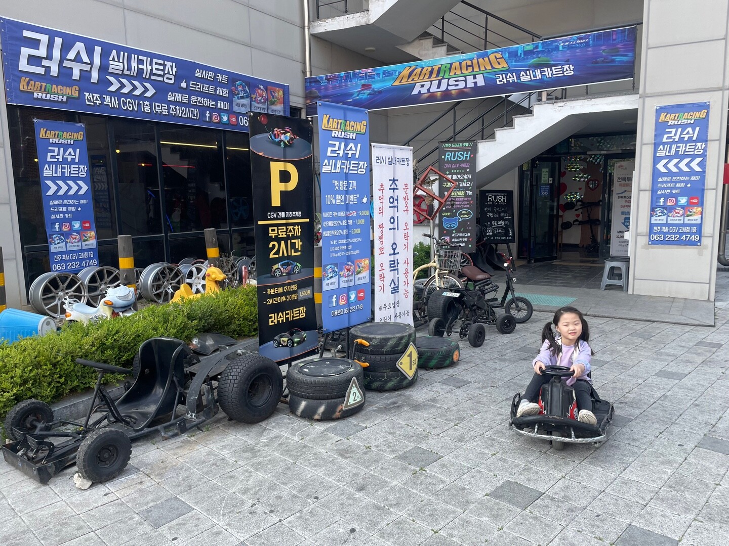 한때 국민게임으로 통했던 카트라이더 드리프트는 귀여운 캐릭터가 카트를 타고 장애물을 통과하며 짜릿한 레이싱을 즐기던 게임으로 남녀노소에게 사랑받던 게임이었다. 이 게임의 실사판이라 할 수 있는 러쉬 실내카트장이 전주시 완산구 CGV 건물에 있다. 아담한 카트는 의외의 속도를 자랑하며 신나는 레이싱을 즐길 수 있어 어린아이부터 추억을 소환하고픈 어른들까지 모두 만족할 만하다. 또, 게임 속에 등장하는 다양한 장애물들이 아기자기하게 구성되어 있어 장애물을 통과하는 재미도 쏠쏠하다. 여기에 옛날 문방구에서나 보았던 오락기가 구비되어 있는 〔7080 추억의 오락실〕과 코인노래방도 함께 이용할 수 있다. 모처럼의 전주 여행에서 비를 만나 야외 관광이 어려워진 관광객이나 아이와 함께 소중하고 즐거운 추억을 만들고 싶은 가족, 그리고 연인들을 위한 특색있는 실내 놀이터라 하겠다. CGV 건물 1층에 있어 넓은 영화관 주차를 이용할 수 있으며, 카트장 이용객은 2시간 무료 주차도 된다.
