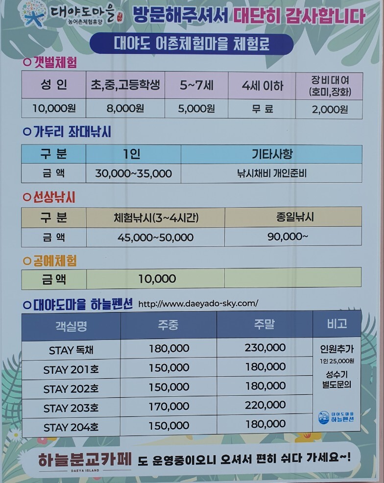 대야도마을은 자연과 체험, 전통과 문화가 공존하는 어촌마을이다. 안면도 동쪽의 천수만을 품고, 서쪽으로는 태안해안국립공원이 인접하여 울창한 송림과 넓은 갯벌이 보인다. 바닷가에서 갯벌체험, 선상낚시, 가두리낚시 등의 체험행사가 준비되어 있으며, 빼어난 자연경관을 자랑하는 해송 숲을 중심으로 7개의 펜션과 민박을 운영한다. 천상병 시인의 옛집과 전통 낚배 등 볼거리가 풍부하며 화가와 목공예가를 비롯한 예술인들이 마을에 거주하고 있다. 마을장터에서는 갑오징어, 낙지, 굴, 바지락 등의 해산물을 볼 수 있어 장터가 열릴 때 방문하는 재미도 있다.