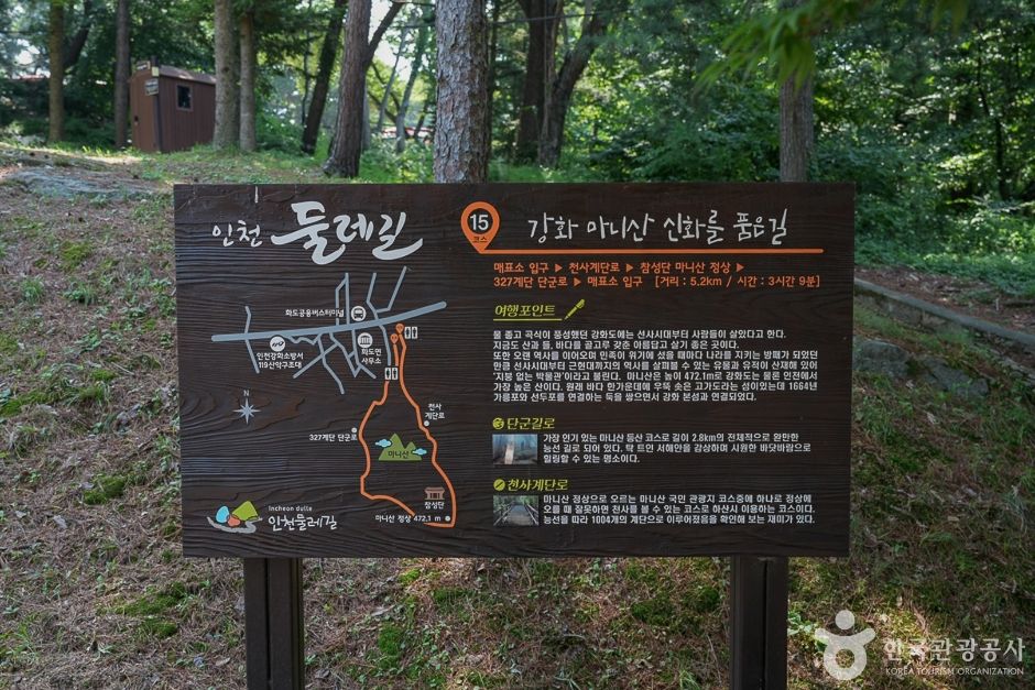 등산코스는 크게 3개로 개미허리라고 불리는 918의 계단로, 단군로, 함허동천 쪽에서 올라가는 코스로 정상에 오르면 인천국제공항과 영종도, 장봉도 등 주변의 섬들이 한눈에 들어와 많은 관광객이 찾고 있다. |