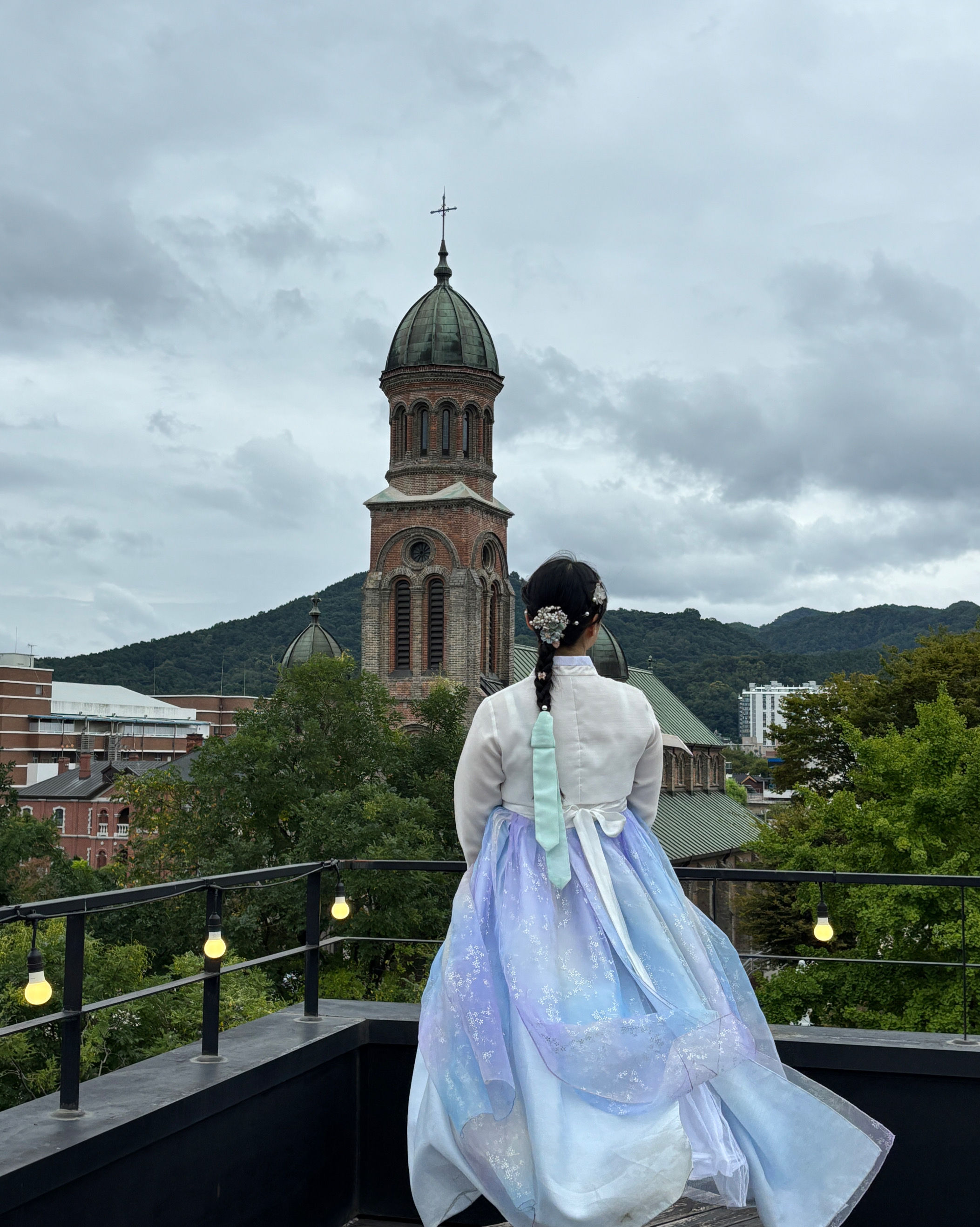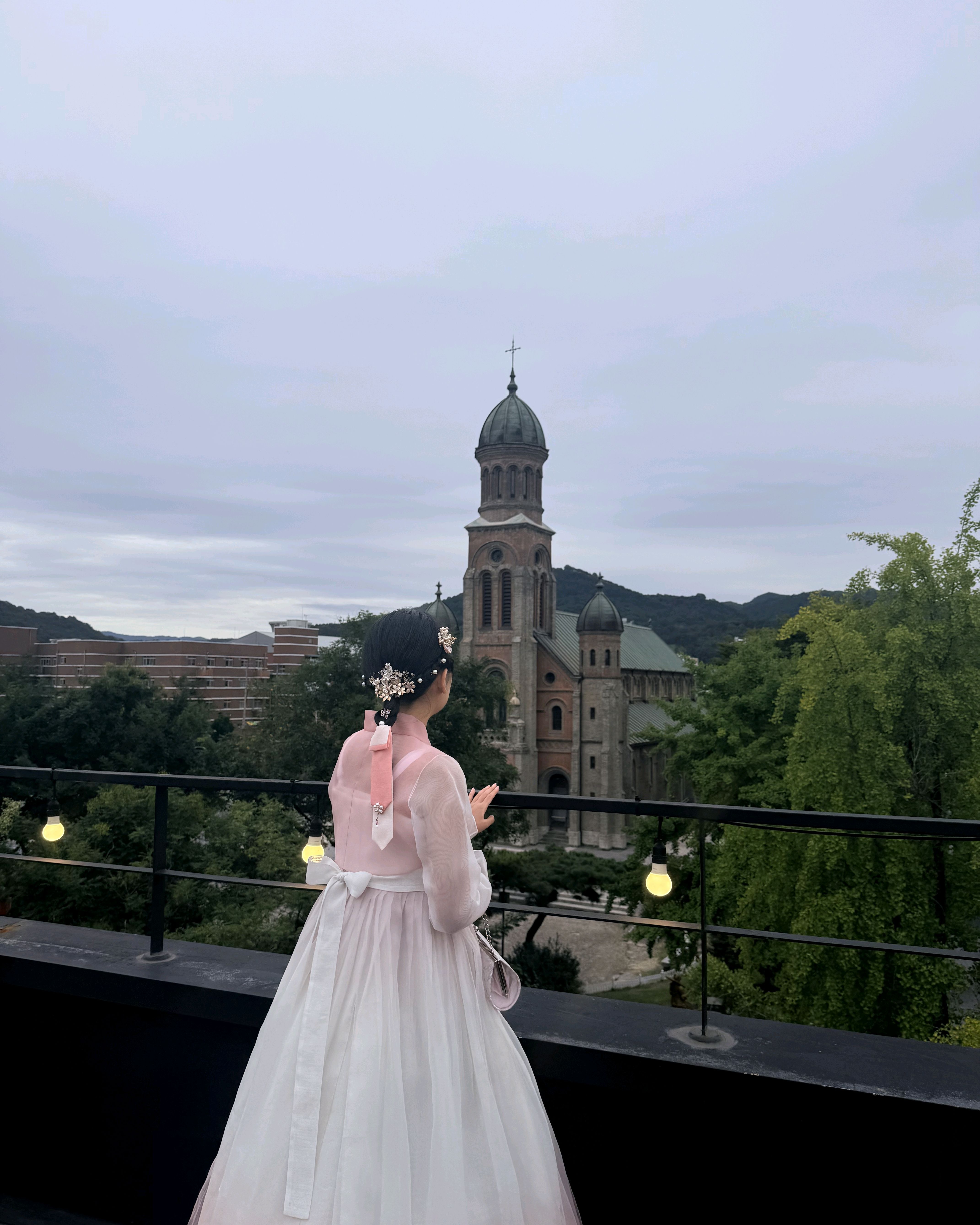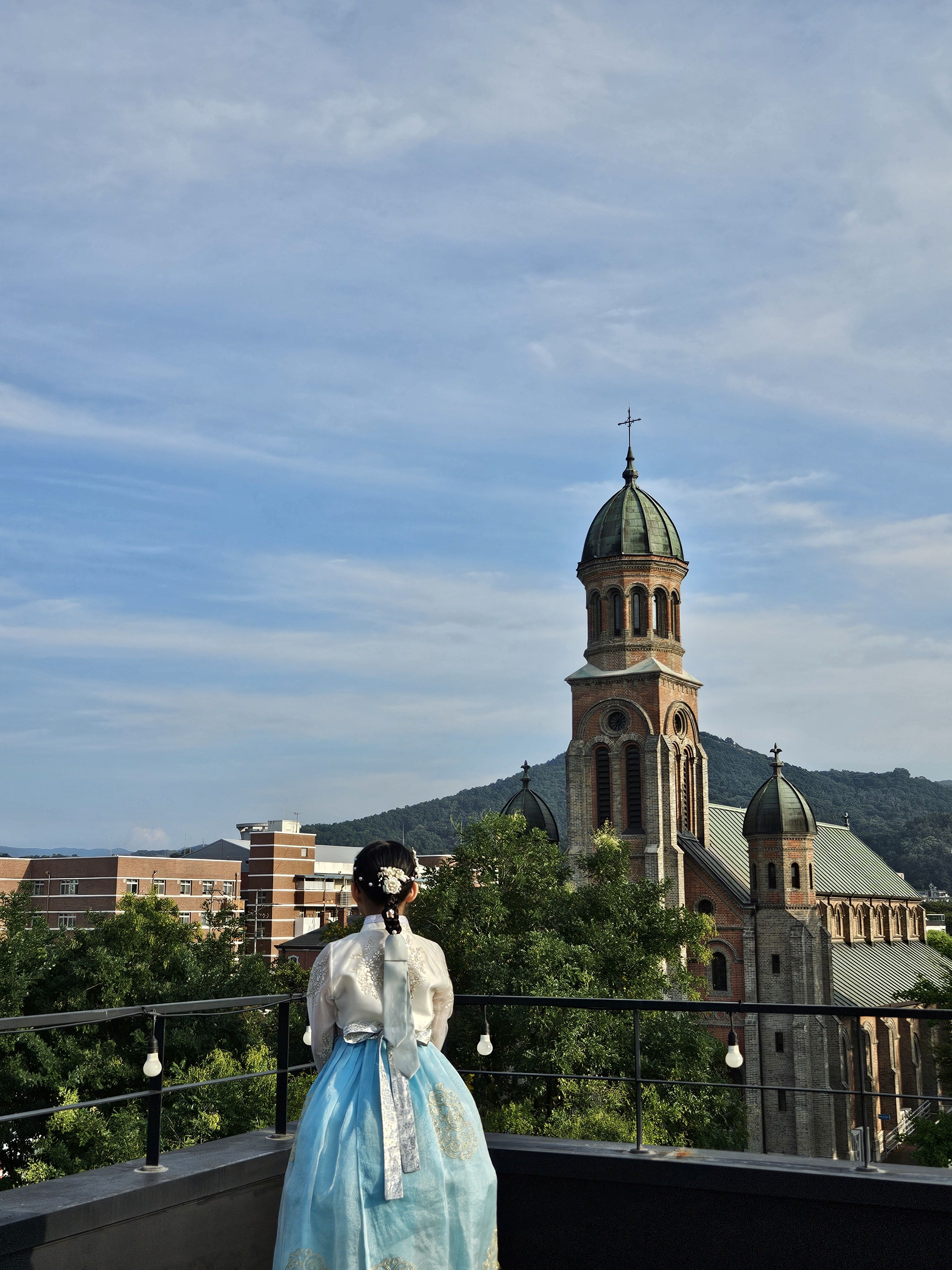 다양한 색상의 한복과 소품들이 많아서 원하는 스타일을 입어 볼 수 있고 탈의실이 깔끔해서 좋았어요! 특히 옥상에 포토존이 넓고 위치가 좋아서 성당과 한옥 뷰에서 예쁜 사진들을 많이 찍을 수 있었어요!