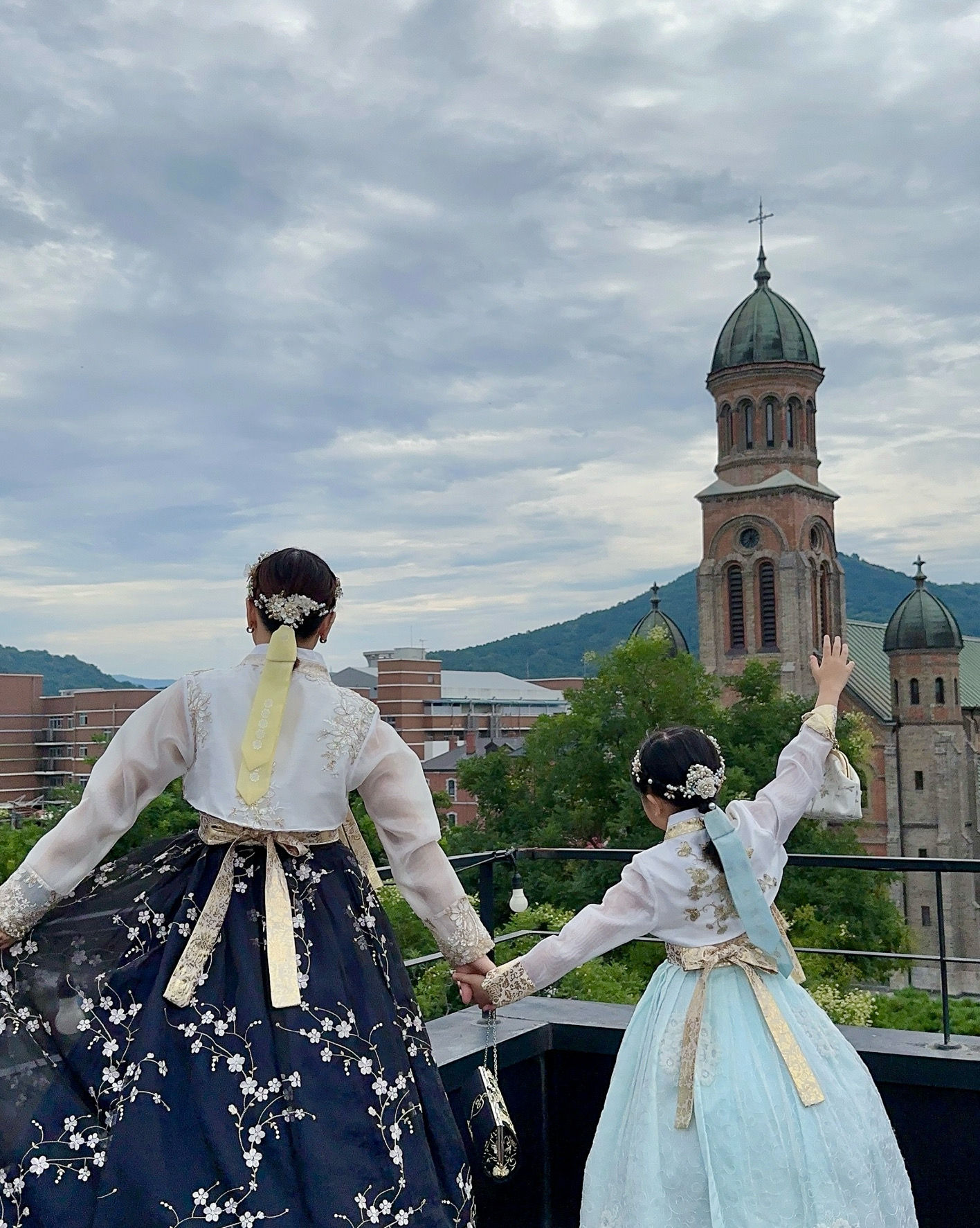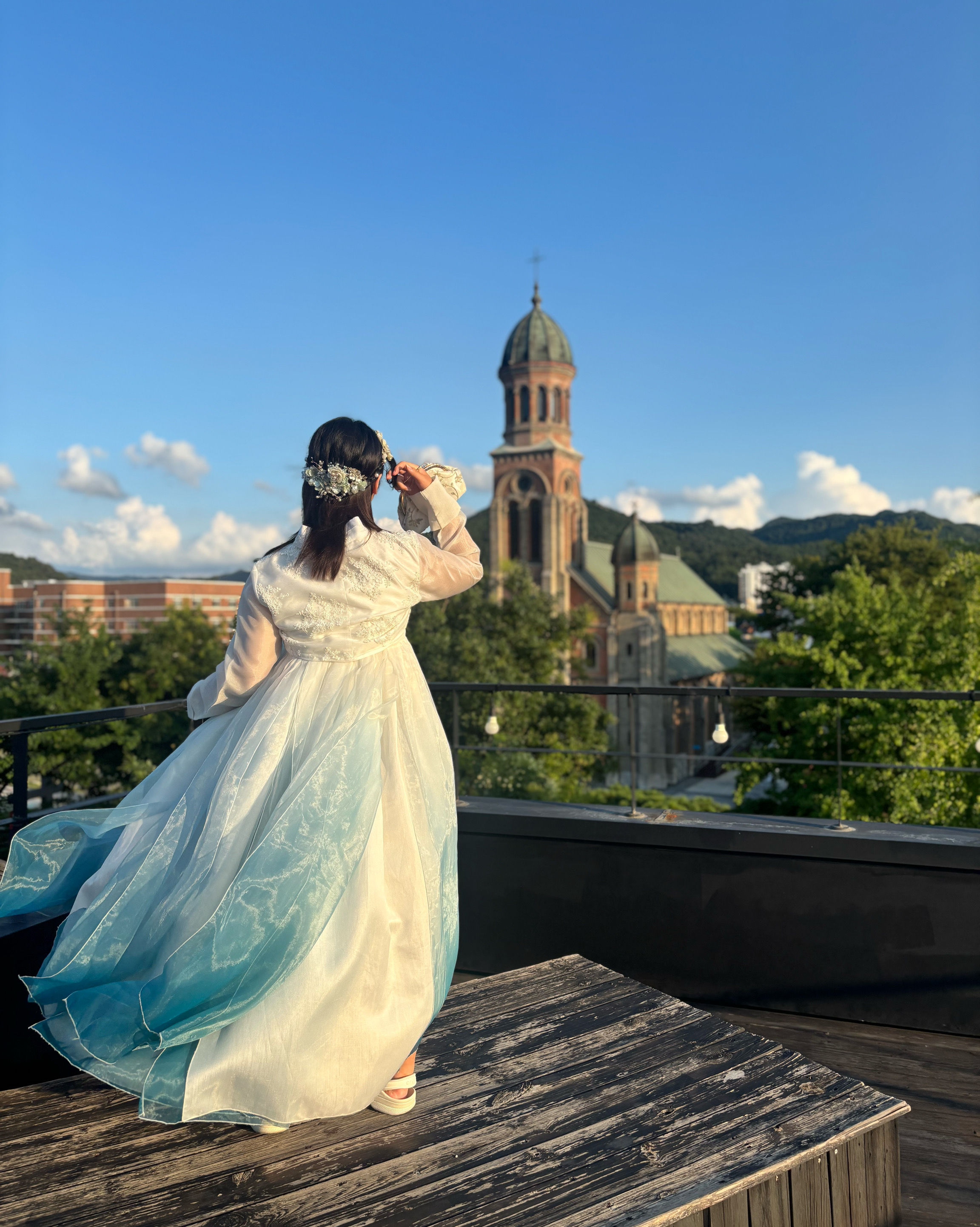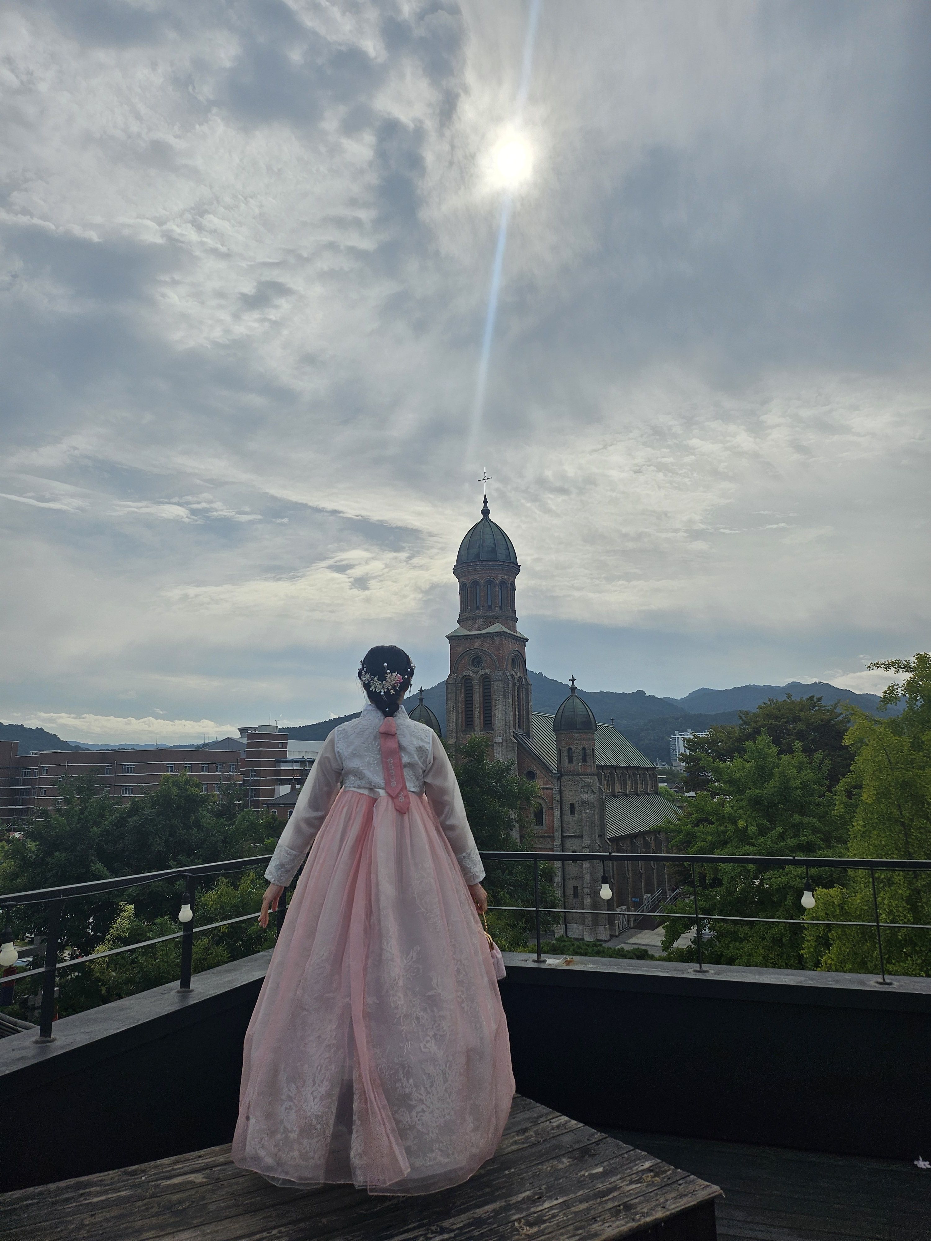 다양한 색상의 한복과 소품들이 많아서 원하는 스타일을 입어 볼 수 있고 탈의실이 깔끔해서 좋았어요! 특히 옥상에 포토존이 넓고 위치가 좋아서 성당과 한옥 뷰에서 예쁜 사진들을 많이 찍을 수 있었어요!