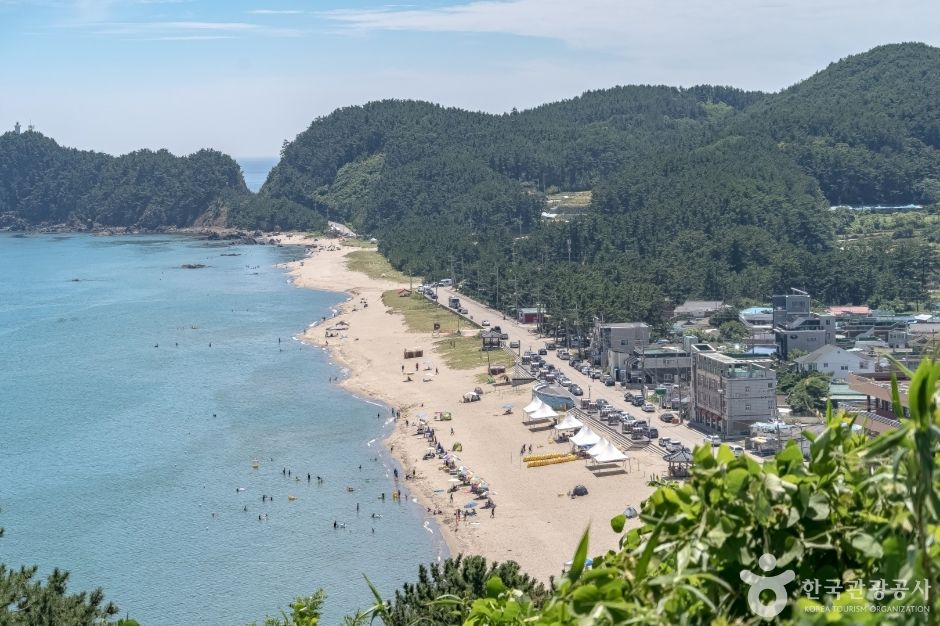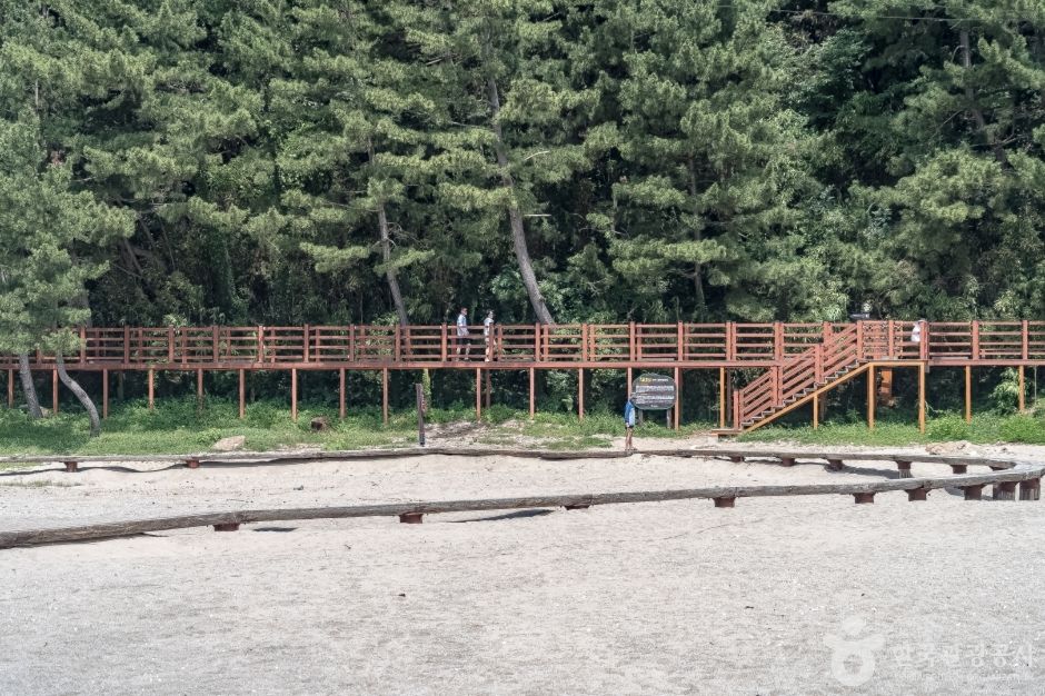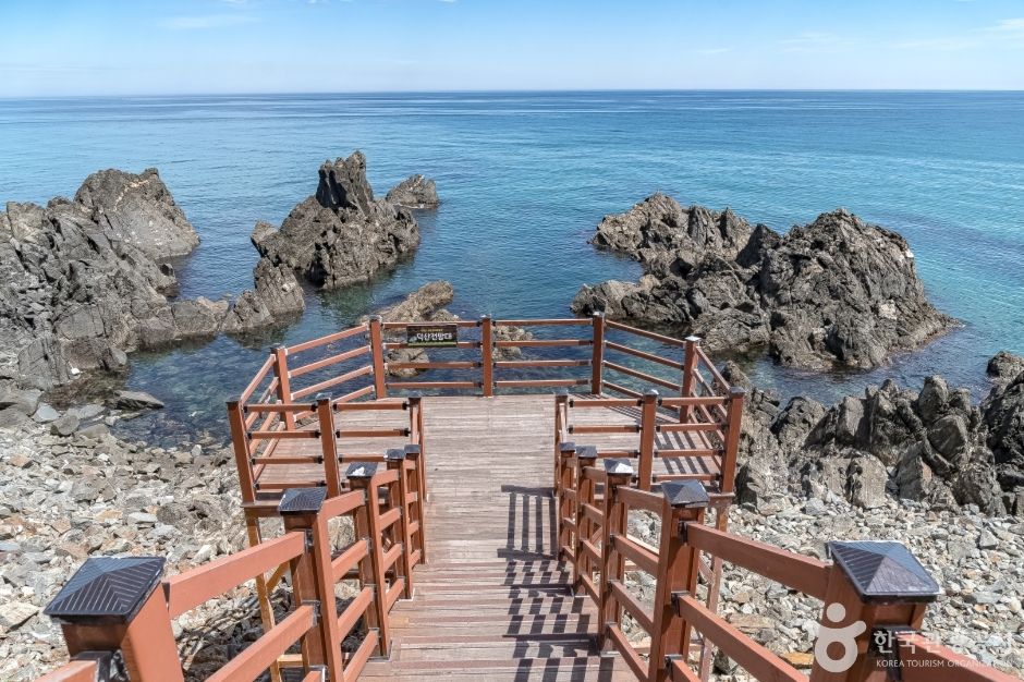 산꼭대기에 화선대와 우물이 있어 가뭄이 들 때 기우제를 올렸음을 알 수 있다. 산 아래는 마읍천이 흐르고 좌측에는 맹방해수욕장, 우측에는 덕산해수욕장이 위치하고 있다. 덕봉산은 군 초소가 있어 통제구역으로 출입이 통제되다가 군 경계 철책 철거와 함께 해안생태탐방로가 개방되면서 53년 만에 숨겨진 절경이 공개되었다. 대나무 숲이 우거진 산책로를 따라 전망대로 올라가는 내륙코스(317m)와 해상 기암괴석을 감상할 수 있는 해안코스(626m)로 구성되어 있으며 산책로를 따라 정상에 오르면 상쾌한 해풍과 함께 탁 트인 바다 풍경과 맹방해변, 덕산해변을 한눈에 감상할 수 있다. |