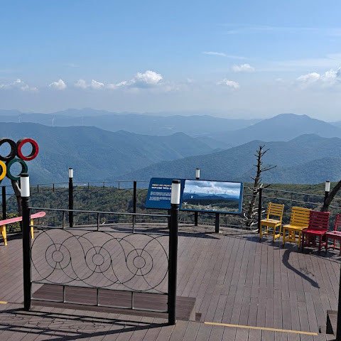 모나용평스키장정상에 있어요, 발왕산을 등산하고 내려오다 잠깐들려도 되고 아님 케이블카타고 올라와서 엘리베이터로 올라가면됩니다. 올라서면 사방이 다보입니다 하지만 강풍이 넘 차가워요