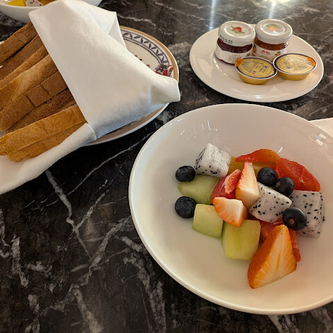 먼저 식빵과 과일 모듬이 나왔다. 음료는 언제 오는지 기다리고 있었지만 5분 경과해 겨우 왔다. 게다가 부탁하지 않는 음료가.