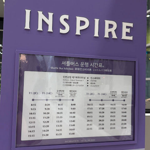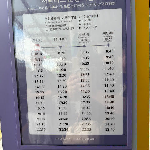 The hotel is about a 15-minute ride from Incheon Airport on a free shuttle bus. It runs once an hour, and the bus is spacious, cool, and comfortable. There’s plenty of room for large suitcases. If you’re staying in the Ocean Tower Lobby” stop—it makes check-in and moving around the hotel much easier.