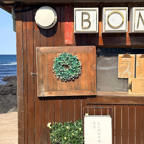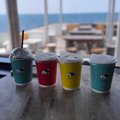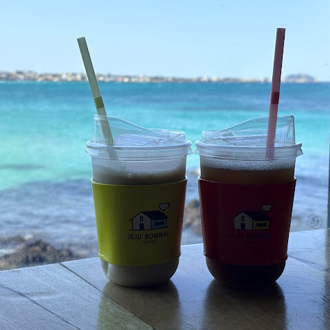 해변 바로 앞에 카페들이 많아요... 한국 드라마 촬영지이기도 하고요. 음료는 입구에 있는 작은 창가에서만 주문할 수 있어요. 모두 유료예요. 바닥부터 천장까지 이어지는 통유리창 옆 자리에 앉아 탁 트인 바다 전망과 자연의 아름다움을 만끽하세요...