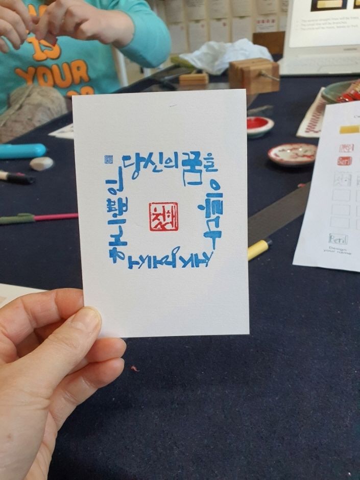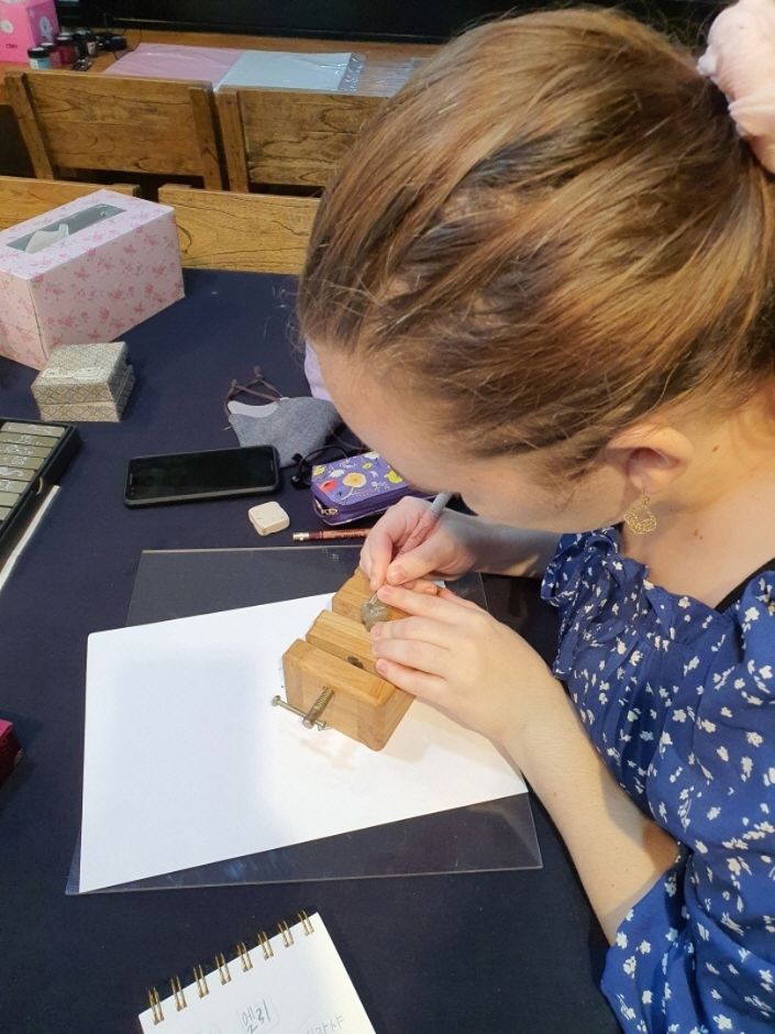 참여자들에게 한국의 도장 문화를 소개하고 한글이나 영어로 디자인할 수 있도록 도와드린 후 돌에 직접 새김을 해 본다. 내국인들에게는 자신의 이름을 스스로 새겨보는 의미 있는 작업을 통해 지금까지 불리어온 자신의 이름에 대해 안부를 물어보며 자신을 돌아보는 시간이 될 수 있으며 외국인들에게는 한국 문화를 직접 체험해 보는 시간을 한글과 영어로 제공한다.