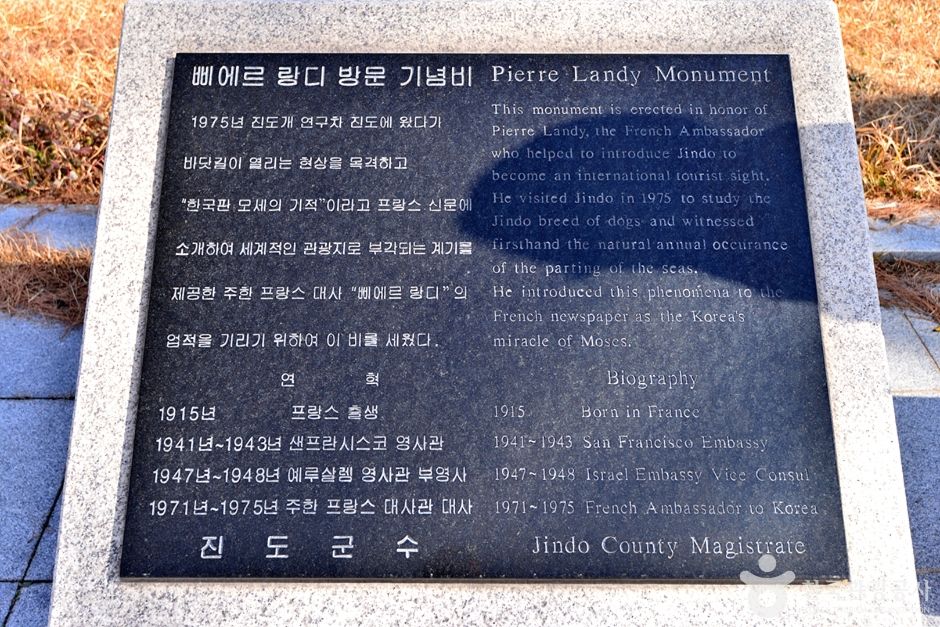 삐에르랑디 공원은 진도 초평항 옆 동기미 정상에 자리하고 있는 공원이다. 이곳은 1975년 진돗개 연구차 진도를 방문한 프랑스 대사인 삐에르랑디가 바닷길이 열리는 현상을 목격하고 프랑스 신문에 [한국판 모세의 기적]이라고 소개함으로써 이곳을 세계에 알린 업적을 기리기 위해 그의 흉상과 함께 기념비를 세우고 공원을 조성한 곳이다.