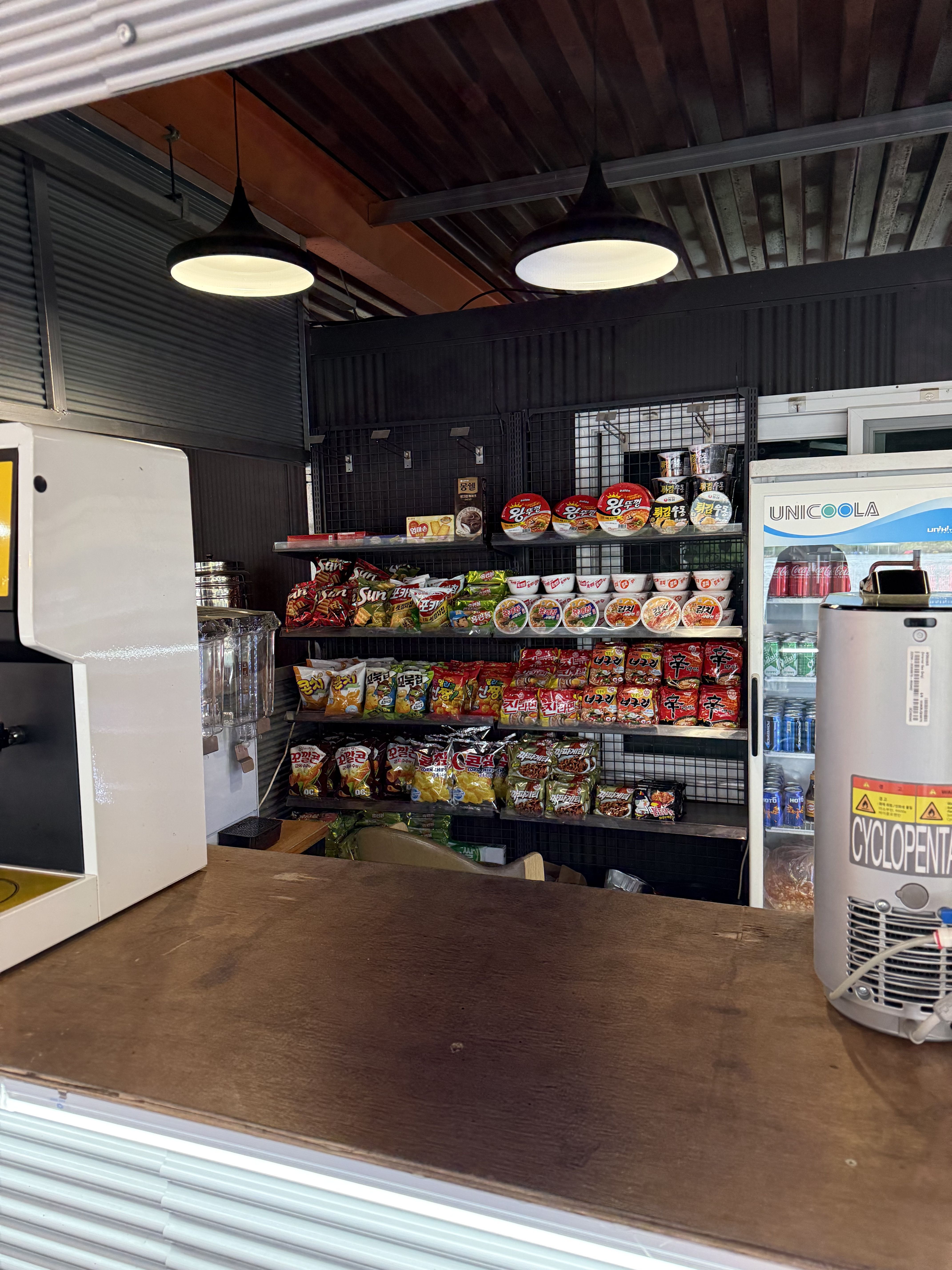 작게 꾸민 카페에서 음료, 과자, 전기구이통닭, 컵라면 등을 사서 먹을 수 있으니 따로 군것질거리 안 가져가셔도 됩니다.