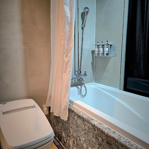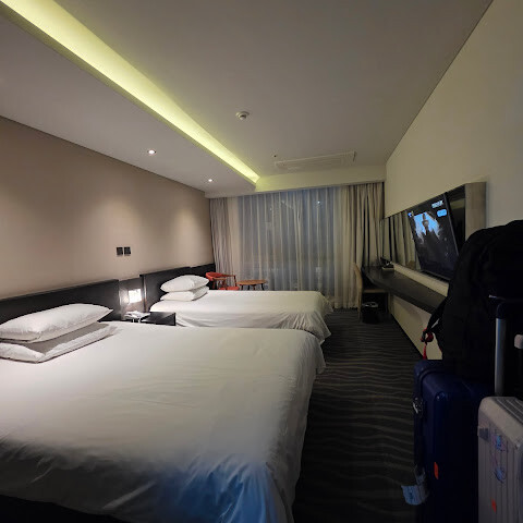 트리플룸에는 더블 침대와 싱글 침대가 있는데, 더블 침대가 꽤 작고 통로 공간이 좁아서 탑 로딩 캐리어를 넣기에 더 적합합니다. 욕실에는 욕조가 있고, 전체 공간은 작지만 수압은 강합니다 👍🏼. 다른 손님 소리가 들리지 않아서 방음이 꽤 좋은 것 같습니다!