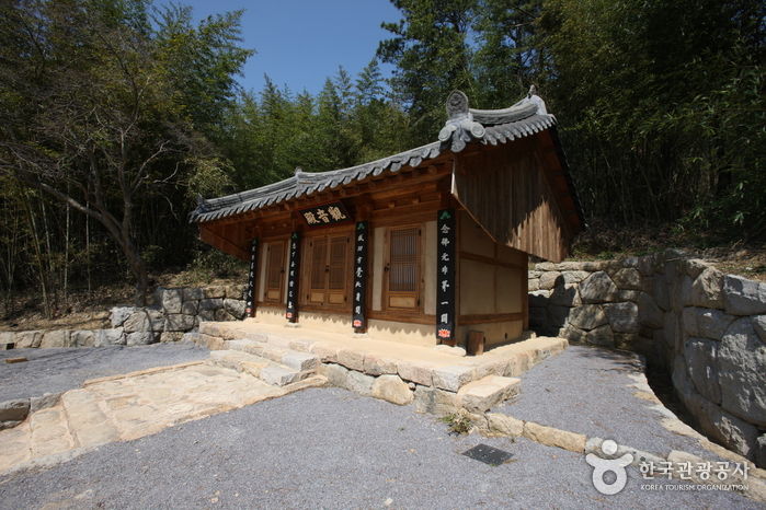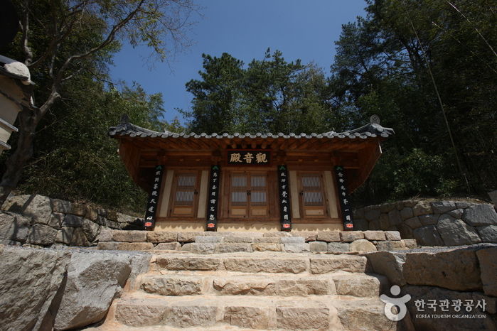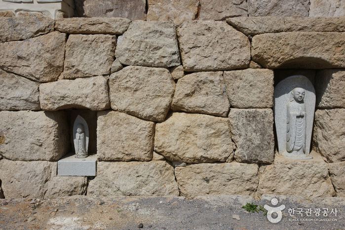 법흥사 대웅전 앞 석축에 마련된 작은 감실 안에는 동자 석상이 있는데, 이 동자 석상은 1985년 음력 4월경 마을 앞 경지 정리를 한던 중 논에서 발견되었다고 한다. 동자 석상은 웃으면서 고개를 살짝 기웃하고 있고, 좌우 대칭이 정확하지 않으며 귀엽고 해학적인 인상이다. 조선 후기 이후의 동자상으로 추정된다. |