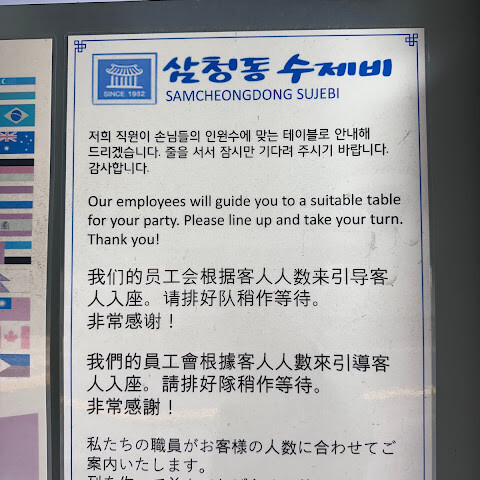 삼청동의 유명맛집 중 하나. 세상에 못 잊을 맛! 느낌은 아니고 그냥 예측 가능한 맛있는 수제비 맛이다. 손님이 워낙 많아 그릇 사용 후 바로 설거지해서 손님에게 나와서 물기가 흥건한 채로 받았다. 이정도로 그릇이 부족하면 좀 더 구비하거나 건조기를 들이는게 낫지않을까 싶을 정도. 별관처럼 옆문으로 입장하는 홀에서 식사하였는데 설거지하는 곳이 다 보였다.(더럽지는 않았지만) 개수대에서 설거지를 마친 식기가 물이 뚝뚝 떨어지는데 바로 배식용 그릇위로 겹쳐지는 걸 보니 여름 위생이 조금 걱정되었다.