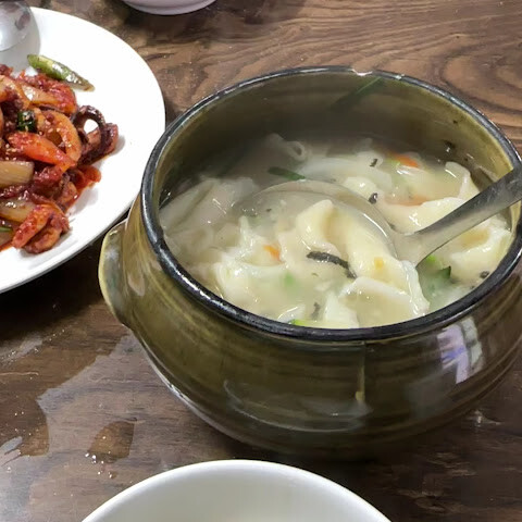 수제비 육수는 진하고 따뜻해서 포만감이 있고, 은은한 조개 향이 나요. 쫄깃한 수제비는 정말 중독성 있었어요. 너무 맛있어서, 특히 신 김치(셀프 서비스)와 함께 먹으니 균형을 잘 맞춰서 다 먹어버렸어요.