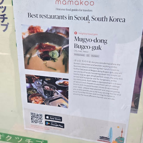 이 국집은 저희 호텔에서 아주 가까운 곳에 있고, 거의 대부분 현지인들로 붐빕니다. 회전율이 매우 높아서 줄이 있더라도 금방 줄어듭니다. 바쁜 와중에도 직원들은 먹는 방법을 친절하게 설명해 줍니다. 작은 접시에 담긴 파소금은 밥에 넣어 먹을 수 있고, 다른 그릇에 담긴 말린 새우, 부추, 김치, 오이절임은 취향에 따라 대구탕에 넣어 먹을 수 있습니다. 수란을 얹어 밥 위에 올려 먹으면 더욱 맛있습니다. 따뜻한 국 한 그릇은 겨울 추위를 이겨내기에 딱 좋습니다. (어른 6명과 아이 4명이 앉았는데, 사장님은 가능하면 8인용 세트 메뉴를 주문하는 것을 추천했습니다.)