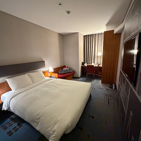 위치가 편리합니다. 아래층에 공항버스가 있고, C U가 근처에 있어요. 롯데푸드코트와 슈퍼마켓도 가까워서 매우 편리합니다. 객실은 짐을 놓을 공간도 충분하고 좌석도 넓어서 움직일 공간은 충분하다고 느꼈지만, 침대가 너무 부드럽고 오목해서 잠들기가 어려웠습니다.