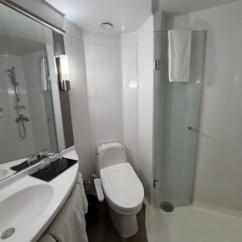침실은 꽤 넓습니다. 욕실은 작아 보이지만 기능적입니다. 분위기는 영락없는 이비스 호텔이에요 🤭. 서비스도 정말 좋았습니다. 프런트 직원분들이 매우 친절하고 도움이 많이 됐어요. 위치도 지하철역(에우지로 1가역)과 공항행 버스 정류장이 가까워서 아주 편리합니다. 하지만 제가 제일 좋아하는 건 피트니스 센터 옆에 있는 온수 욕조 시설이에요. 정말 최고예요 👍👍👍👍